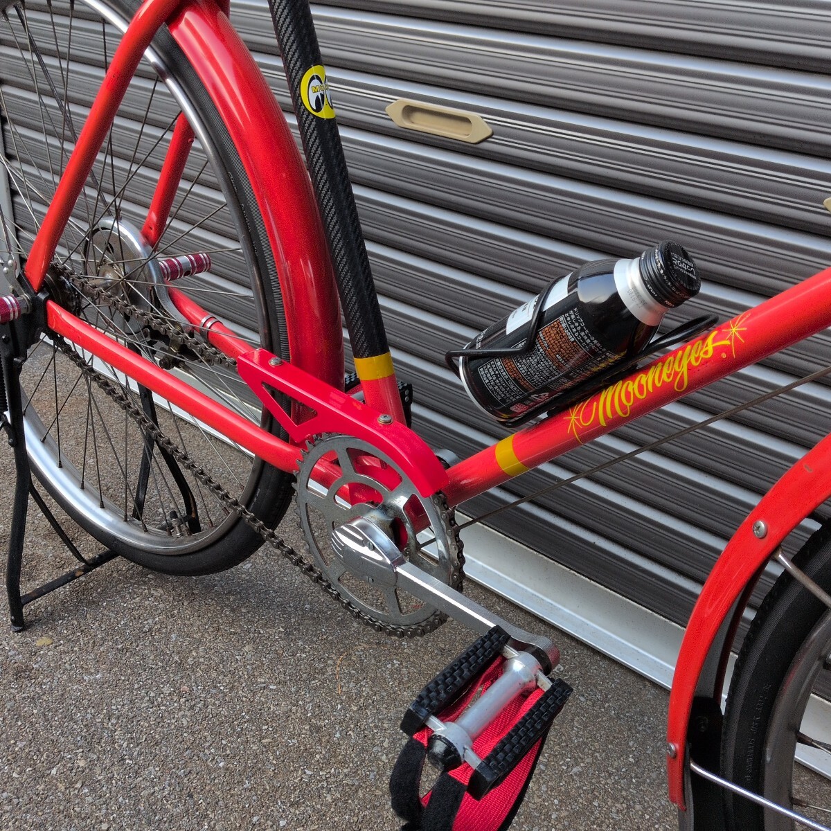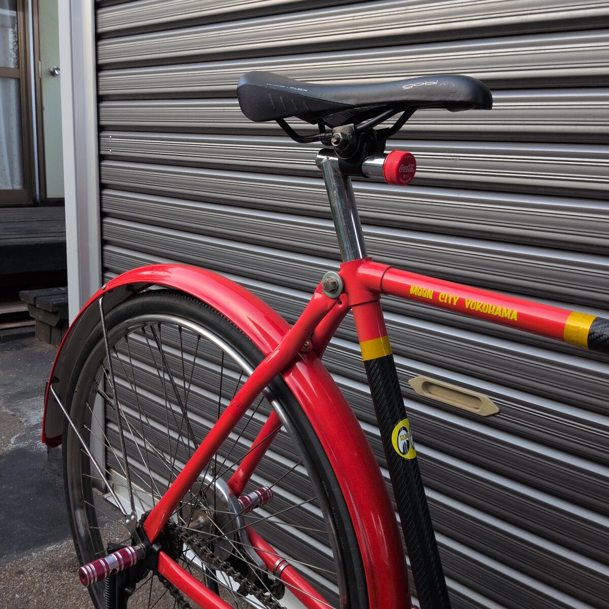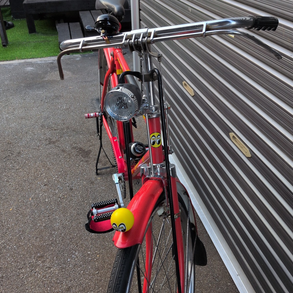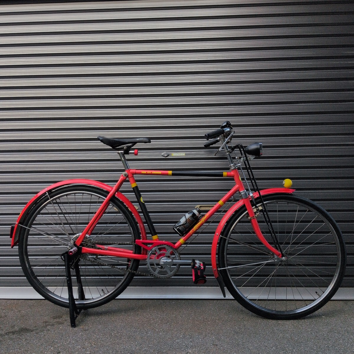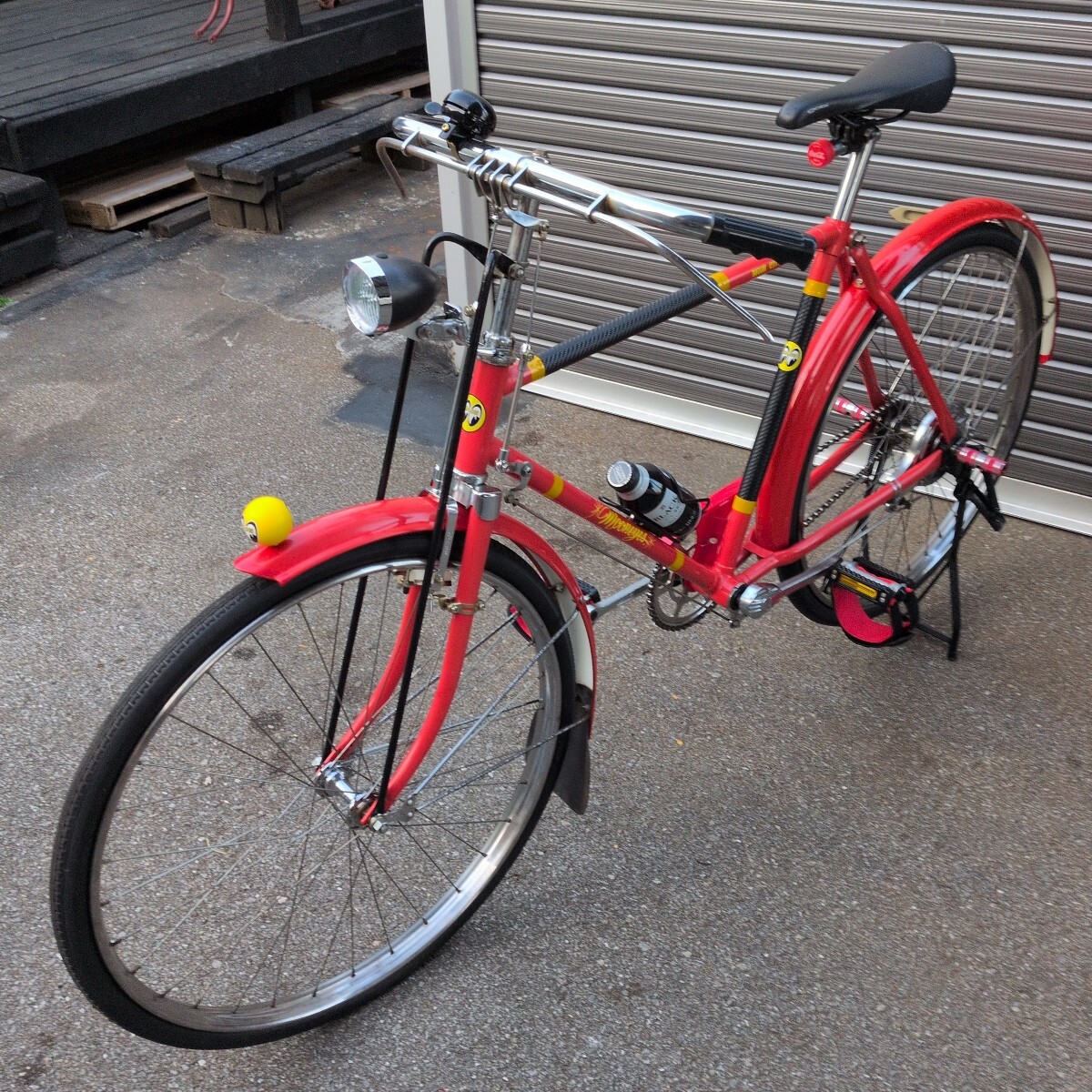 1980s頃の丸石郵政車をカッコ良く速く走れる様に改造しました。まずベース車入手後得意の全バラし洗浄磨き上げしました。まずフレームですがダウンチューブにボトル台座直付ゲージ取り付けトップチューブとシートチューブにカーラッピング用の高級カーボン柄のシート貼り付けました。縁は黄色の反射テープです。ダウンチューブにW氏のピンスト風デカールヘッドとシートチューブにムーンのマークフェンダー先端に風切代わりにカーアンテナポールを取り付けました。ホイールは新井ハブ 新家ステンリム 鉄スポーク タイヤとチューブはお馴染みシンコーのゴールデンボーイ3/8BE通称金玉の新品取り付け前後リム振れ取りハブBBヘッドグリスアップ済みです。ブレーキは新井Fオール新品リアバンドは残量有りで大丈夫です。ギアは44x20tで新品チェーン ペダルは反射付き軽合金ゴムペダルなかなか無い品です。あとスピード出す時の為にバンドストラップ赤色付けました。サドルはスポーツタイプの取り付けヘッドライトはLED電池式新品ベル新品 飛ばした時ハンドルが動くと危ないので当方オリジナルの補助バー取り付け チェーンカバーも赤色の小振りなオシャレなの取り付けました。あと後輪にハブステップ取り付け 実用自転車で速く走る事に拘って造りました。欲しい方いましたらノークレーム ノーリターン ノーキャンセルでお願いします。引き取り希望ですが西濃運輸支店止め可能です。送料は5000円位からです。西濃は伝票に電話番号記載必須の為落札された方はお知らせお願いします。栃木県宇都宮からの出品です。