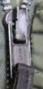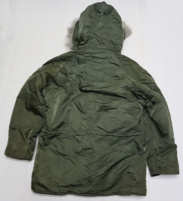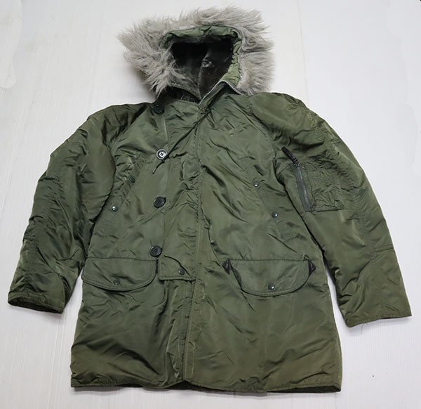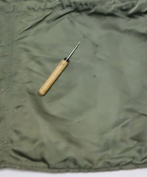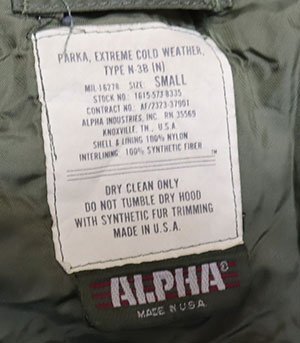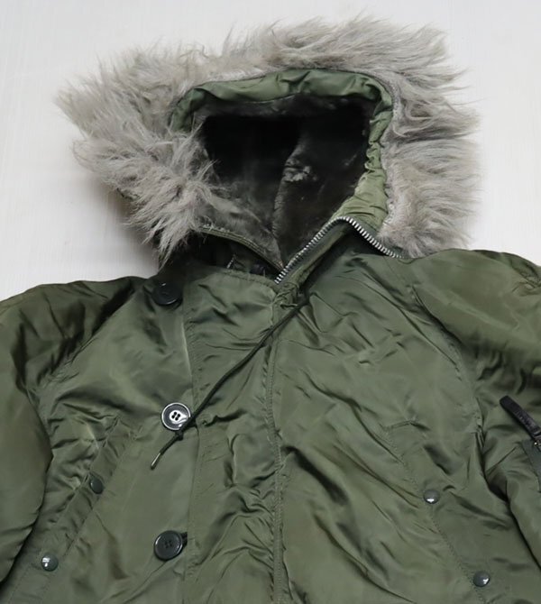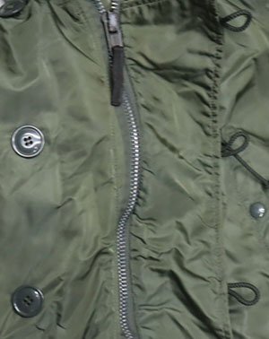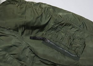 アメリカ買い付けの90年代頃のアメリカ製ALPHAのN-3Bフライトジャケットの襟はアクリルファで緑系のIDEAL製ZIPです。