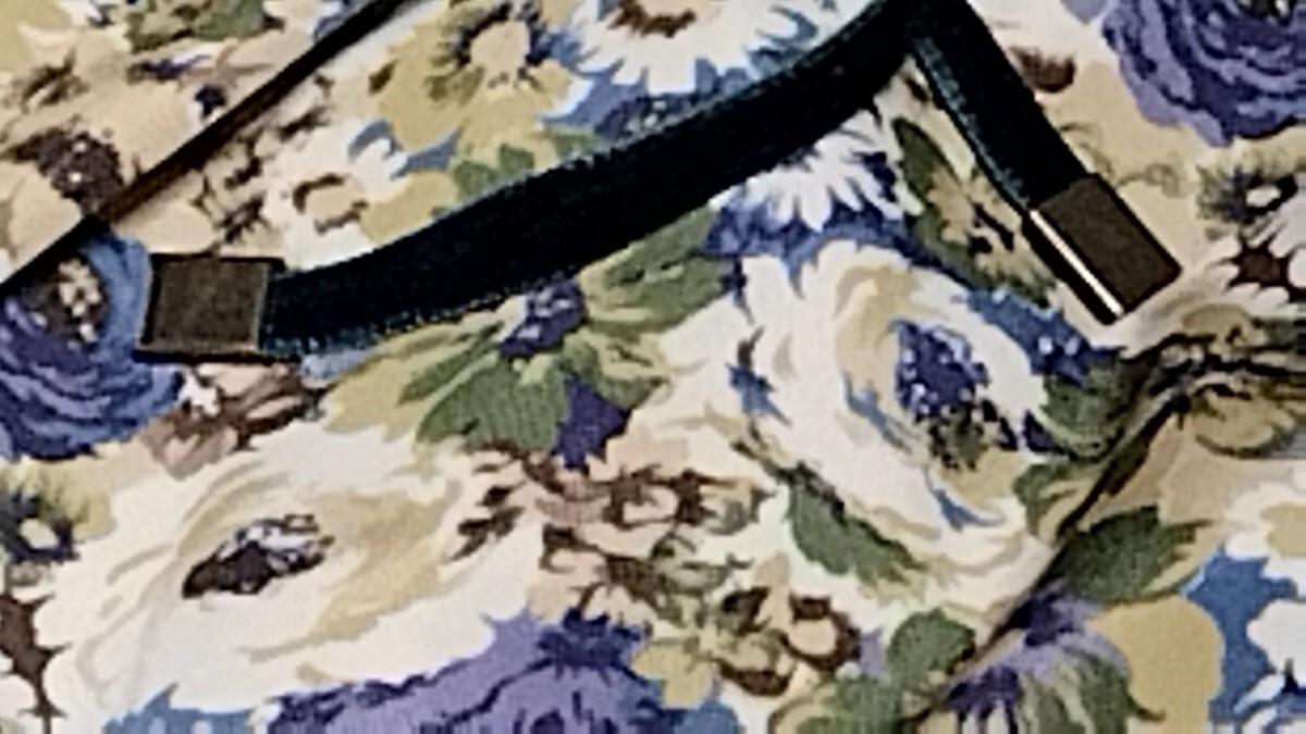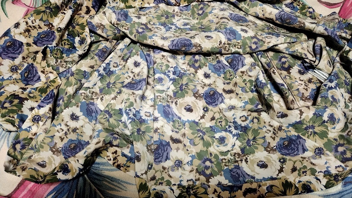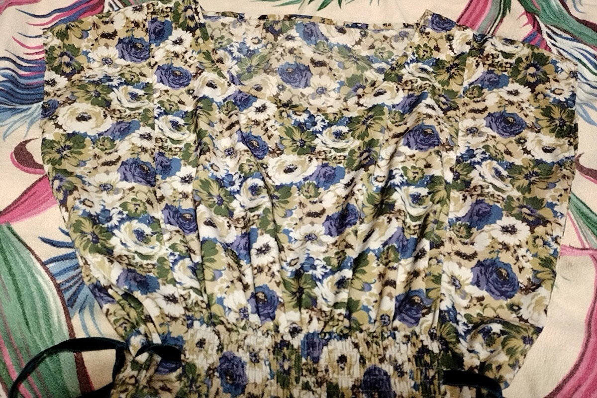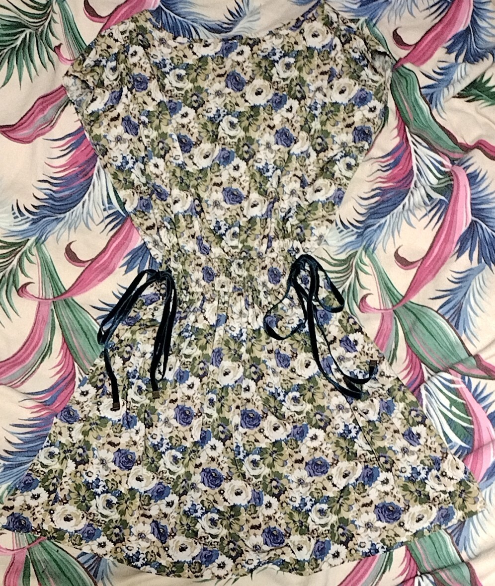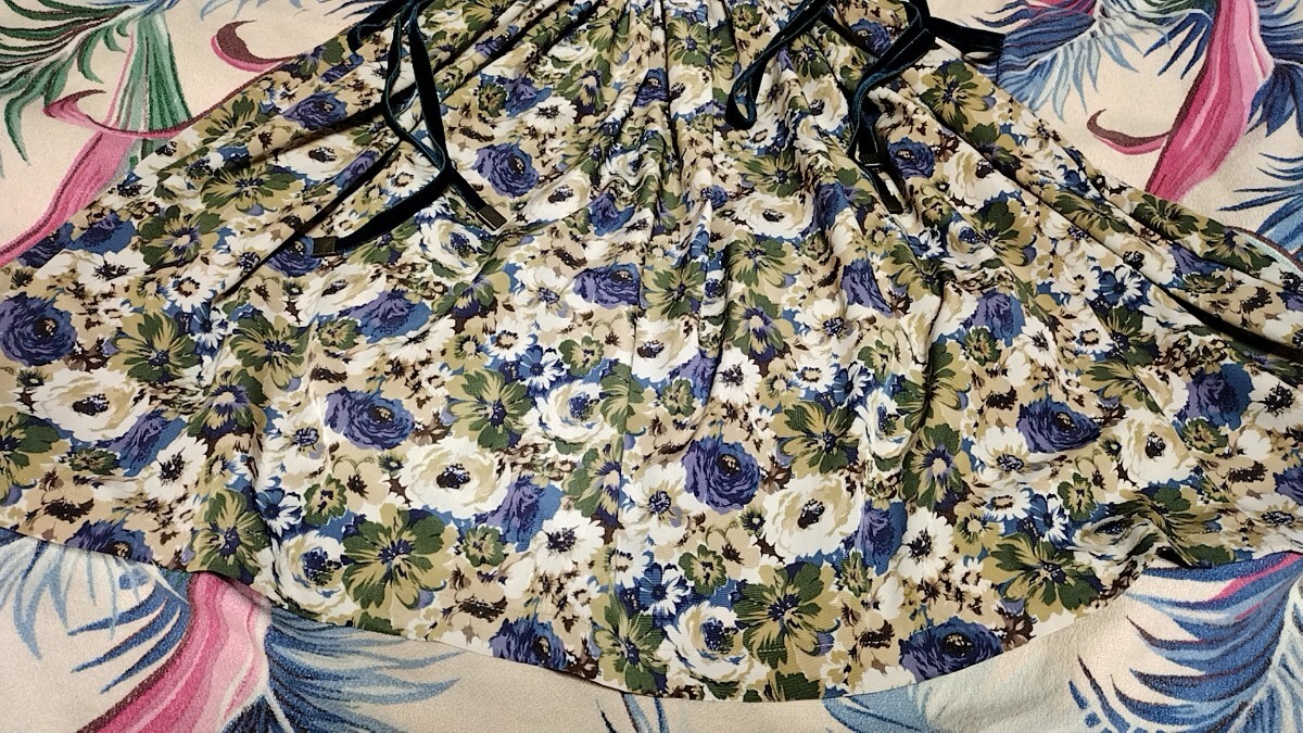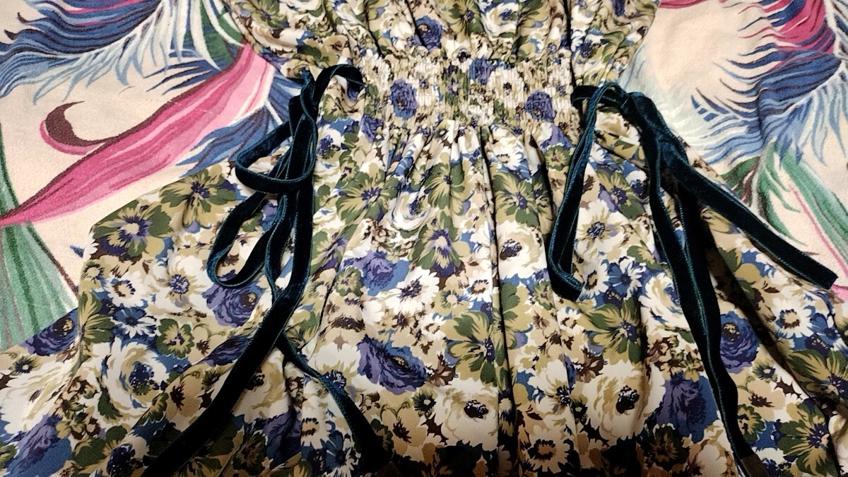 フェミニンなフラワープリントと両サイドのロイヤルブルー色のベルベットリボンが特徴的な一着。