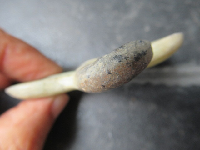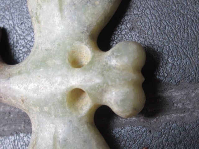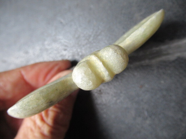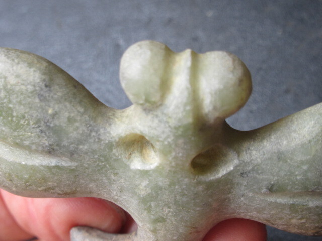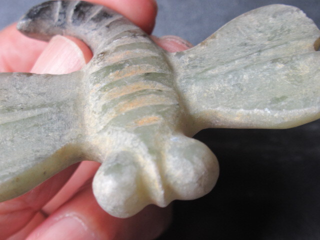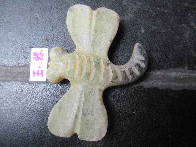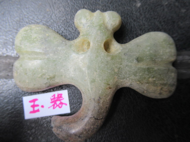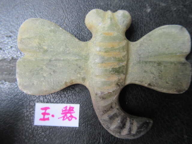 玉器未鑑定品。材質はネフライトより軟らかめの石と思われます。とんぼ形。背面がイモムシ風で、腹面平坦。吊り紐穴は腹面に古風な円錐形カウノーズタイプ。タテヨコ厚さ50/67/10mm。送料無料。
