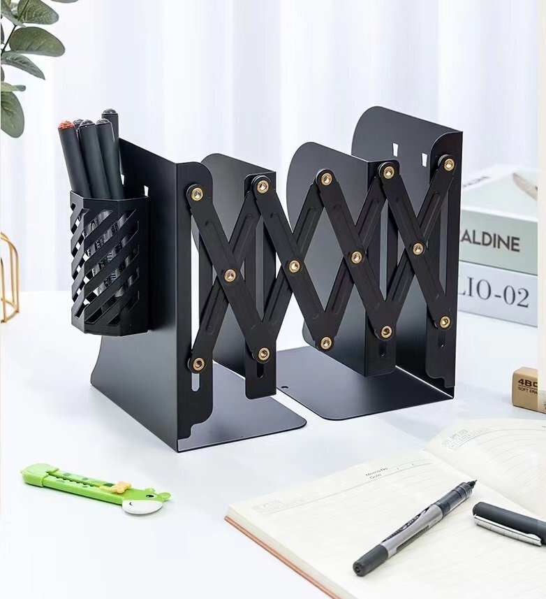 卓上本棚 ラック 本立て ブックスタンド 伸縮自在 ペン立て付き 金属製 卓上収納 デスク整理 仕切りスタンド ブラック MAY10256