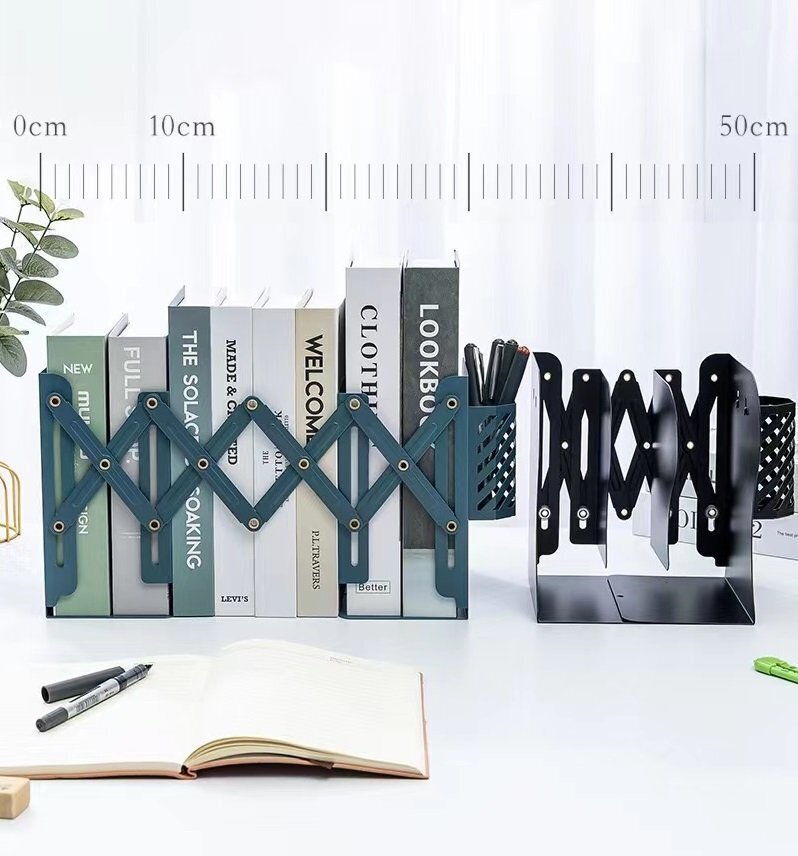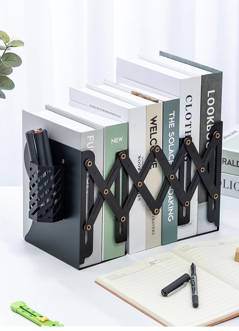 【伸縮設計】幅は10cmから50cmまで調整可能。本の数によってサイズを調整できます。便利性と収納性能が非常にいい。一般的な文庫本や新書、単行本サイズを立てておくのにぴったりですが、辞書やDVDなどの収納にも適しています。 【高品質素材】高品質な金属を採用して、重さが約790g。軽量けど変形しにくい、もっと安定します。無地な色が落ちにくく、耐久性があります。接続部分は高品質の銅とシリコンを使用し、自由伸縮がスムーズで、耐用性が高く、使用時間が長くなります。 【筆立て付き】:あらゆる種類のペンが散らからないようにして、使いながら持ち運びます。ペンホルダーの両側を自由に交換して取り出すことができます。ホルダーは取り外し可能です。 【複数の分離設計】:3つの分離、整理、整然とした収納;それぞれの格は独立して使用することができますが、整理整然と収納され、書籍、雑誌、図画書などは分類して保存することができます。取り出す時にとても便利です。