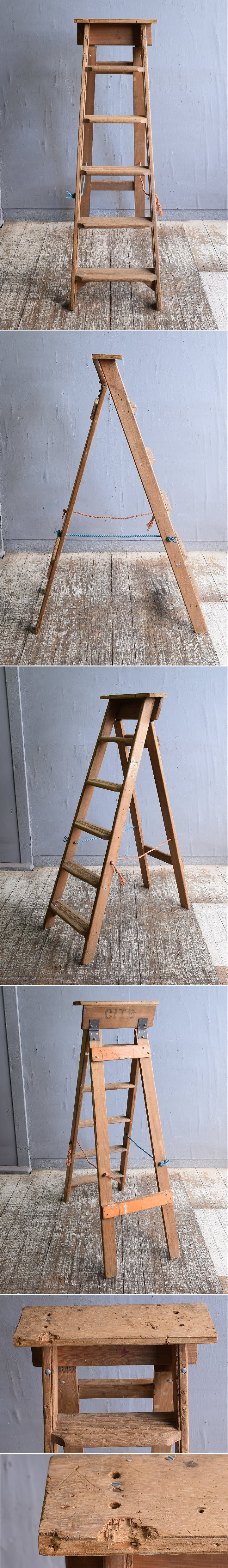 イギリスの蚤の市で見つけてきた古い、木製ステップラダーです。 使い込まれた風合いがとても素敵です。 お花屋さんや雑貨屋さん等ショップディスプレイの アクセントにオススメです 。 長年の使用、乾燥により磨耗、アタリ、割れがあります。(画像参照) 大きなダメージ無くコンディション良好です。 天板だけ集成材です(画像参照)