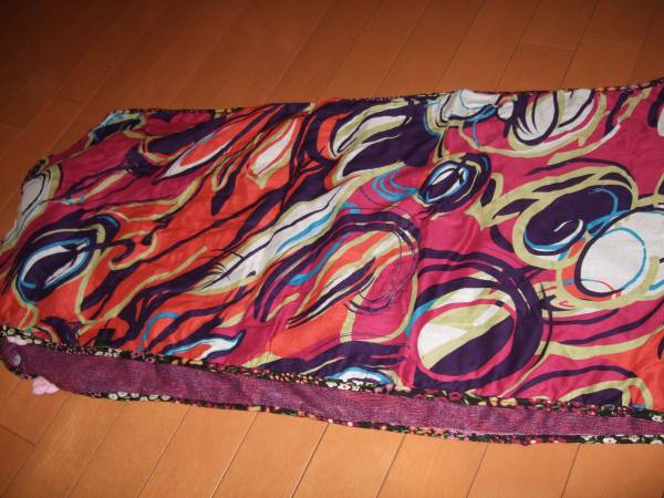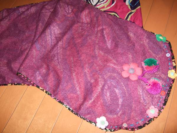 美品、1、2回程度使用した程度ですのできれいです。素材表示などはないのですが、ダブルフェイスになっており、ニット面と、コットンのプリント面になっています。セレクト系の商品で、インポートショップのセレクト系の小物アイテムの売り場で購入をしました。長さも大き目で、ほかにはない個性のあるデザインです。インポートもののようで、またクラフト感のあるアイテムですので、細かい点を気にされる方はご遠慮ください。サイズ感も大き目です。長さ約177、幅約41です。赤紫っぽいニット面と、オレンジ、赤系統のコットンプリント面、全体的に差し色になる明るいお色です。