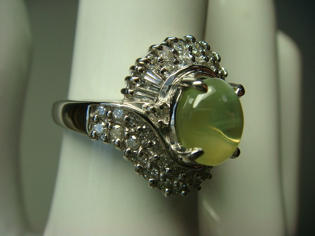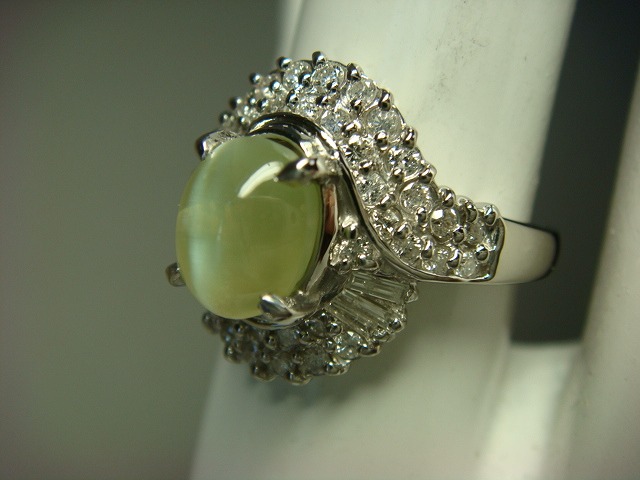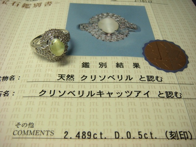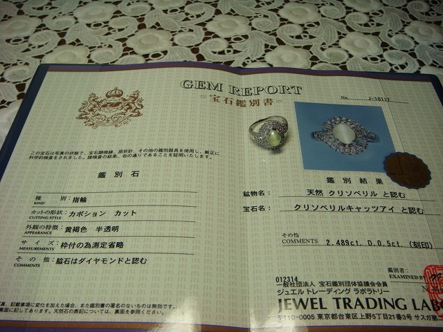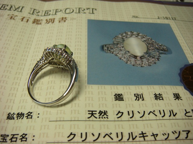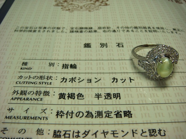 | ご覧頂きましてありがとうございます! プラチナ製キャッツアイ&ダイヤモンドリングです。サイズは約13です。ダイヤは0、5カラットです。キャッツアイは2,489カラットです。 PT900、2,489、0、5の刻印入り。重さは約7,5gです。新品仕上げ済み。鑑別書付き。 新品の箱に入れてお渡しいたします。 追加画像がありますのでパソコンでご確認ください。 宝石との出会いは一期一会です。『いいな』と思ったら是非、身につけてあげて下さい。きっと宝石も喜ぶことでしょう! 宝石は決して貴女を裏切りません。身につけた貴女を守ってくれることでしょう。 いつも頑張っている自分へのご褒美にいかがでしょうか? 良いものをひとつお持ち下さい。一生物のジュエリーとなります。 画像での判断は難しいと思いますが、落札後の返品、クレーム等の無きよう、目利きの方、お解りになる方、面白そうだなと思った方、ご自分の自己責任においてご入札下さい。 モニター、パソコン、カメラによって色や感じ方が変わりますのでご注意下さい。商品についてはコレクター、質屋さん、お客様の委託品が中心ですので、ご質問の答えが遅くなる事がありますがご了承下さい。 商品説明につきましてはすべてをお知らせできませんので、質問にてお願いいたします。 基本的にはUSED品ですので、その点を十分にご理解の上ご入札下さい。途中で出品を取り下げる場合もありますがご了承下さい。 尚、トラブル回避の為、申し訳ございませんが、新規の方及び評価によってはこちらで入札を削除させていただく場合もございますが、ご理解下さい。 メールの確認は夜になりますのでご連絡が遅くなることもありますがご了承願います。 品物にも人と同じように『こころ』があると思います。喜んでいただけることが私にとっても品物にとっても一番良いことだと思います。 『落札したけど気に入らなかった』ということが無いように十分にお考えになってからご入札下さい。 発送は宅配便を予定しております。また発送には2,3日かかる場合もございますが、ご了承願います。 落札金額より僅かですが『子ども虐待防止 オレンジリボン運動』へ寄付をさせていただきますがご了承お願いいたします。 | |
