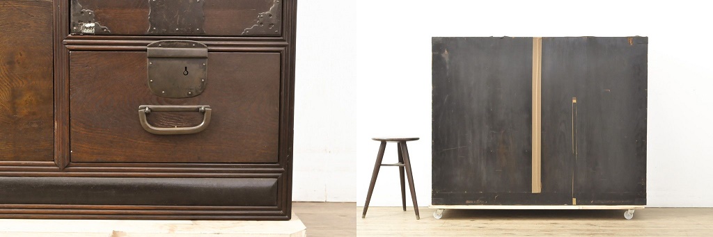 和製アンティーク 大正昭和初期 高級品 中桐 真鍮金具と渋い色合いが魅力的な上手物のサイドチェスト(引き出し、収納箪笥、和たんす)(R-057623)です。