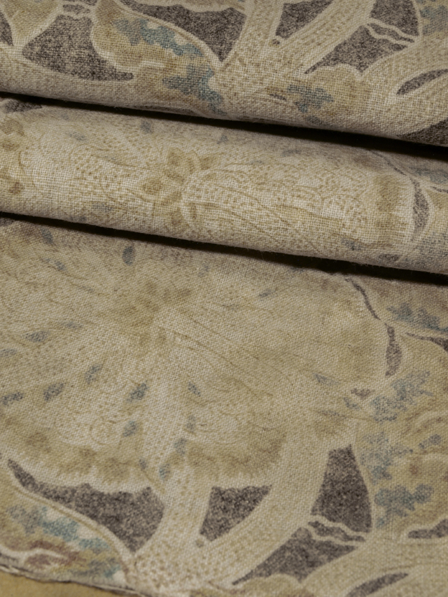 黒茶色の地に、唐花草の文様が染められている、綿の堺更紗のはぎれです。 明治期ごろにつくられたと思われるアンティークのお品です。ざらりとした古手の糸味に趣が強く感じられます。 全体的に褪色しているほか、下端から約 19cm の左耳直近に直径約 2cm のカギ裂きが 1 か所、上端から約 8cm の中央右に直径約 1mm の小穴が 1 か所ありますが、そのほかに目につく大きなしみやよごれ、褪色などのダメージはなく、この時代のものとしてはきれいな状態です。生地の力はあります。※風楽の出品内で配置違いの柄の異なる共布を出品している場合もあります。 |