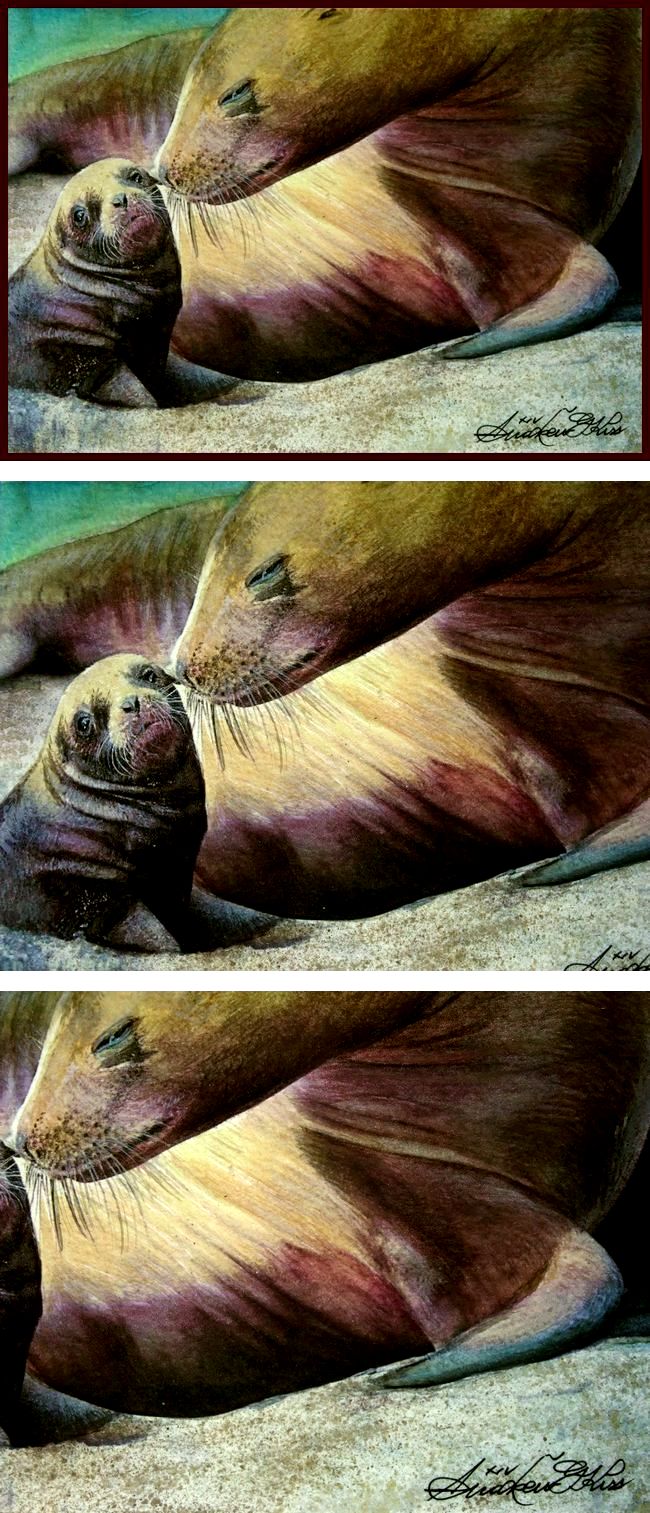 | 美しい水彩画「子をあやす母アシカ」 | |
