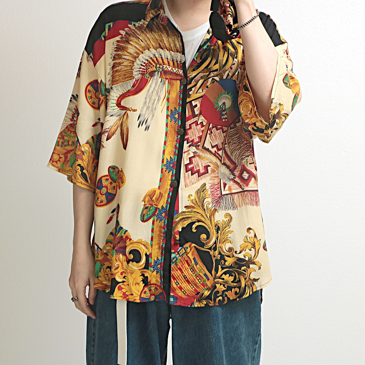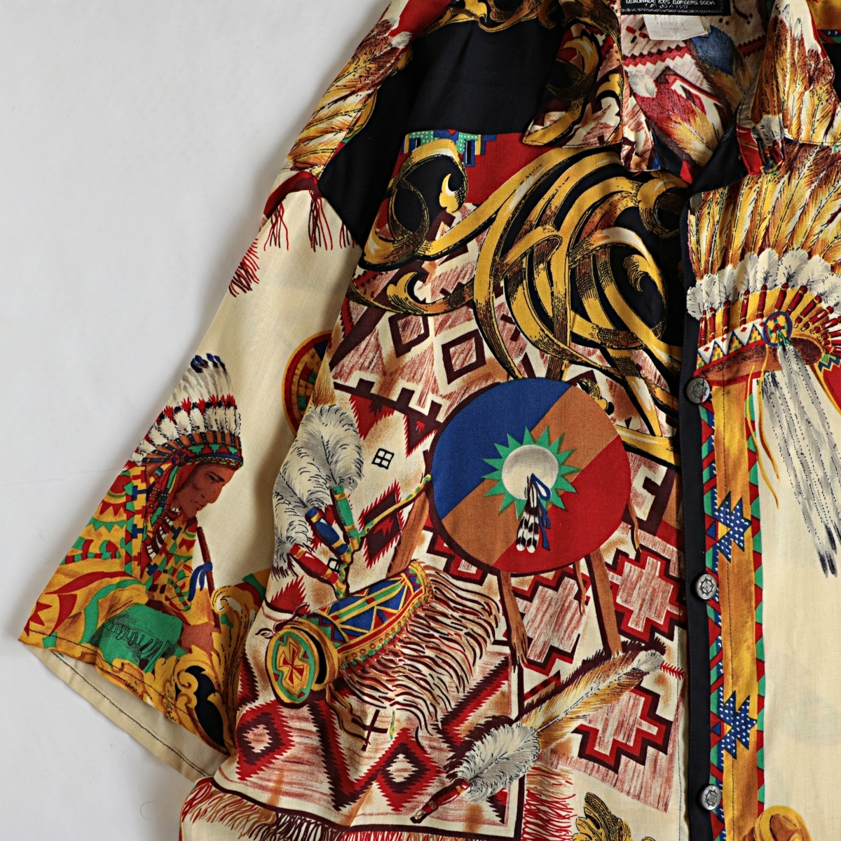 80-90s CAFE インディアン 柄 レーヨン 半袖 シャツ 古着 used