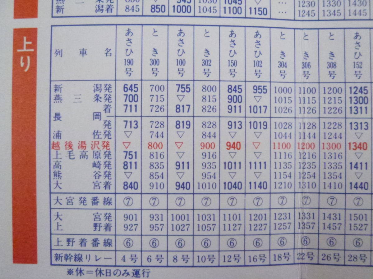 時刻表は、昭和57年11月15日改正分で上越新幹線開業時の越後湯沢駅のものです。