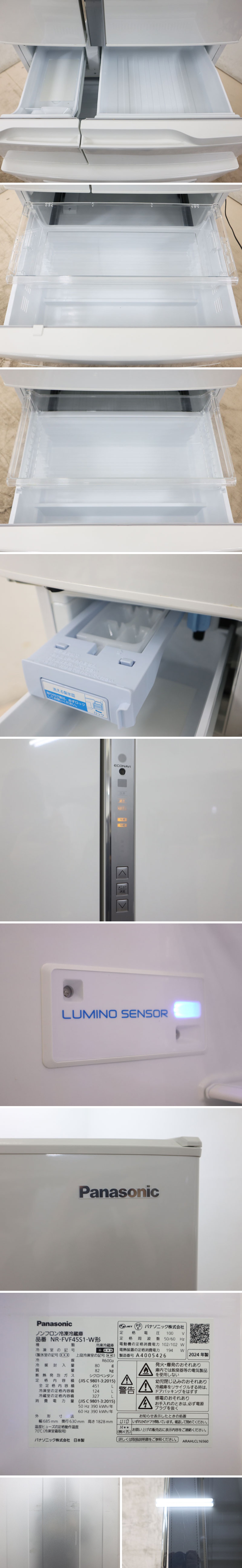 【仕様】 【型番】 NR-FVF45S1 【仕様】 定格内容積:451L 各室容量:冷蔵室/定格内容積 232L、食品収納スペースの目安/(175L)うち、チルドルーム(16L) 製氷室/14L(3L) 上段冷凍室/26L(14L) 冷凍室/84L(57L) 野菜室/95L(68L) 年間消費電力量:50Hz・60Hz、390kWh/年 外形寸法(幅×奥行×高さ):685×630×1828mm 据付必要奥行寸法:662mm 質量:約82kg カラー:ハーモニーホワイト ※HP参照(画像は100%正確な色味では御座いませんので気になるお客様は世田谷区船橋の倉庫でご覧頂けます、色味での返品・返金は一切お受け出来ませんのでご了承下さい。) |