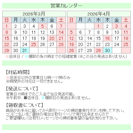 | 営業日15時までにこちらで入金確認が取れましたら当日発送可能です (15時以降及び店休日、棚卸日のお振込は翌営業日発送) 16時~18時頃に郵便局の窓口に差出して発送します (普通郵便以外は必ず17時までに持ち込み、当日の取扱いにします) 午前中・店休日、棚卸日の発送はありません 発送完了しましたらメールでお知らせいたします 追跡番号も発送完了メールでお知らせします (※営業時間の関係で発送通知が遅れる場合があります) |