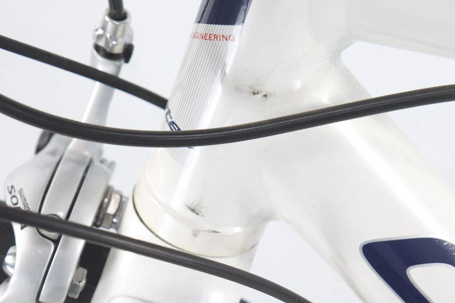 左チェーンステー内側に欠け、左フォーク・左シートステー・左シフター・左右クランクにキズ、リアディレーラーに小傷、ヘッドチューブ周りに変色・スレ、トップチューブ・右シフターにスレ、その他車体各所にスレや細部に汚れがあり、全体的に使用感のあるお品物となります。
