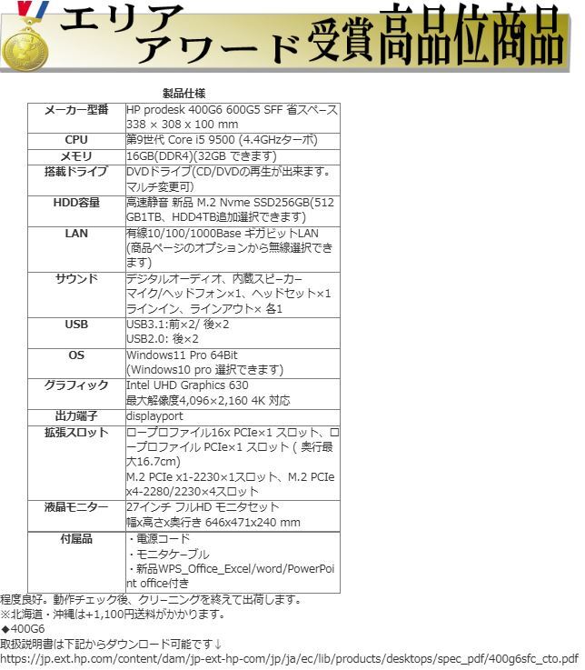 | 送 料 | ◆本州・四国・九州内各都府県は送料無料! 北海道/沖縄は送料1100円 ※ パーツ等小型商品は出荷から到着まで1~2日程度かかります。 ・PC・モニタ等の配送は、日本郵便 ゆうパック便でお届けいたします。 ・パーツ等はポスト投函便にてお送りします。 ■来訪での引取も可能です。 |
