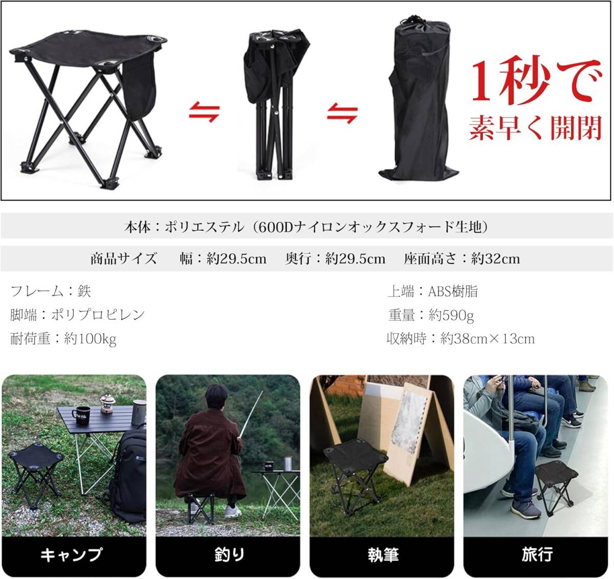 【幅広いシーンで活躍】コンパクト設計で収納に困らず、マンションのバルコニーや急な来客時にも重宝。キャンプ、花見、バーベキューはもちろん、防災備品としても安心の耐荷重。スポーツ観戦からガーデニングまで、あらゆるシーンで活躍するマストアイテムです。