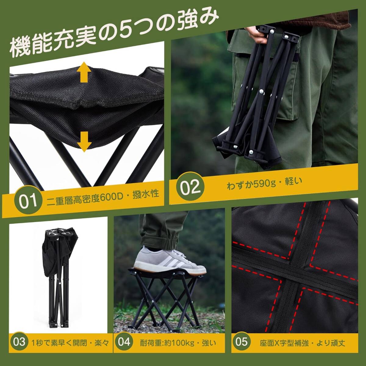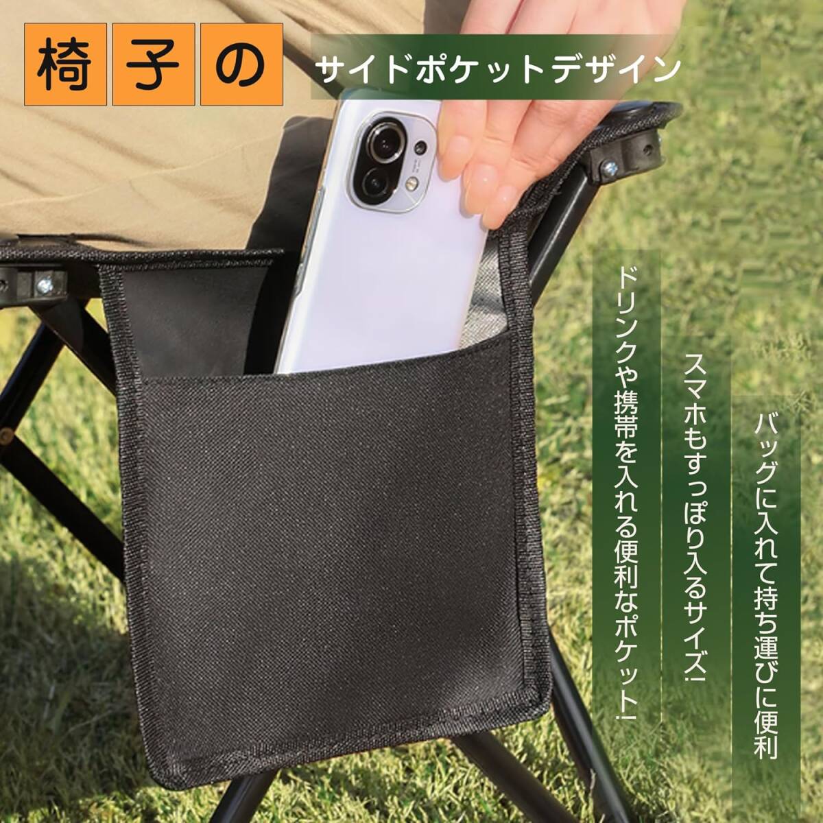 【椅子のサイドポケットデザイン】ドリンクや携帯を入れる便利なポケット!スマホもすっぽり入るサイズ!バッグに入れて持ち運びに便利。がっしりX型フレームと四脚構造で、100kgの耐荷重を実現。抜群の安定性で、安心して快適にお座りいただけます。