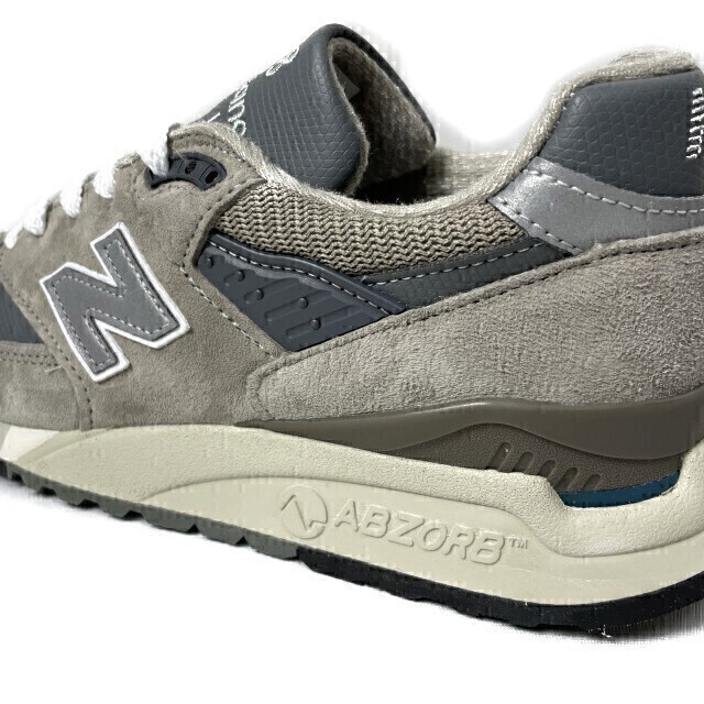 「ABZORB(アブゾーブ)」を初めて搭載し、高い衝撃吸収性能を実現した「998」は足にしっかりフィットし、長時間使用しても疲れにくいことからランナーに支持を得ました。こちらはグレーをベースにした定番カラー。