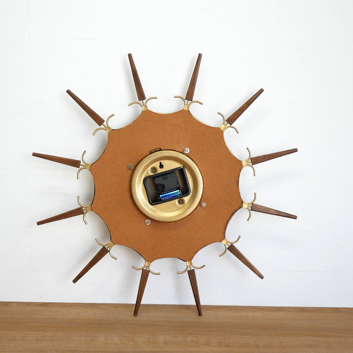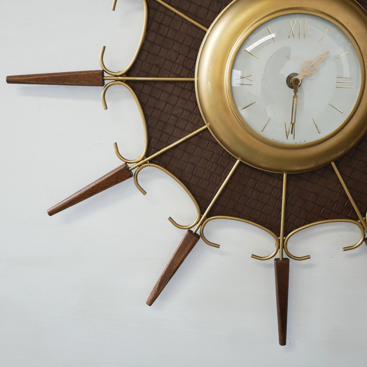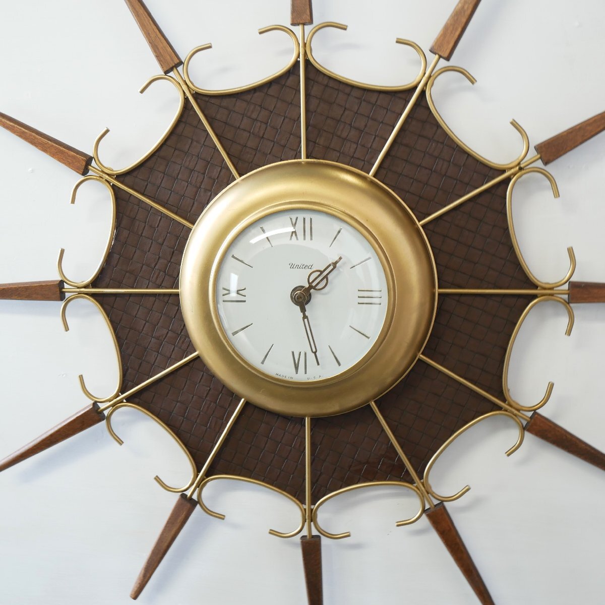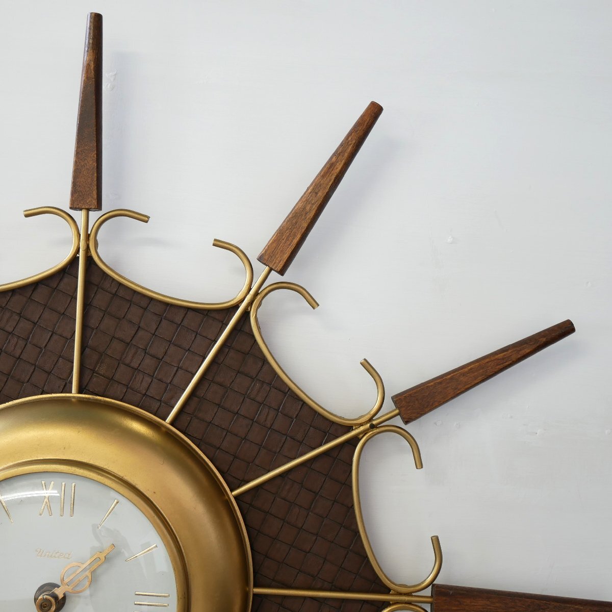 | 商品説明 explanation | United社のサンバーストクロックです。※1950年代から1960年代 太陽のような放射状のデザインが魅力です。 文字盤(メタル) カバー(ガラス) 放射状の飾り(木、メタル、合皮) ミッドセンチュリースタイルのインテリアにいかがでしょうか。 元は電気式でしたが、カチカチと音がしないスイープクオーツの乾電池式ムーブメント(中の機械)に交換していますので、時間はほぼ正確です。 |