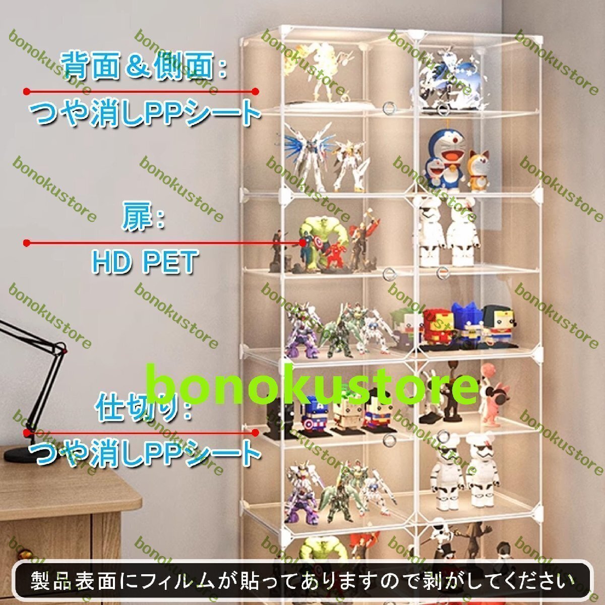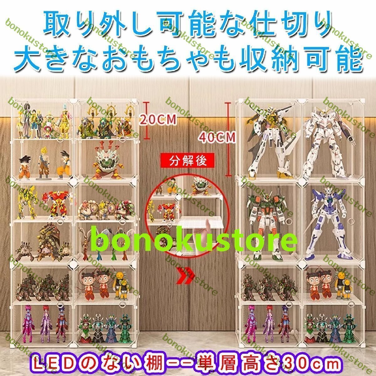 CESTRY---フィギュアケース 透明 大型 ディスプレイラック 収納棚 整理棚 多用途 組み立て式大容量、組み立て自由自在な魔法の収納ボックス!高品質の透明でいつでも大切なフィギュを見ることができます。大切なコレクションを埃から守り、いつも綺麗な状態で展示できます。この収納ボックスは、フィギュア以外にも、ジュエリーや小物や鞄などを収納することができます。多目的に使用できるので、おしゃれなインテリアとしても活躍します。【製品仕様】 - -(材料:)背面・側面:フロストPPシートパーティション:つや消しPPシートドアパネル:HD PET - - (サイズ:)LEDライトなしのディスプレイスタンド、単層高さ30cmLEDライト付きディスプレイスタンド、単層高さ20cm奥行き30cm【ご注意ください! ご注意ください! ご注意ください! 】1.製品の表面には保護フィルムが付いていますので、ご使用前に剥がしてください。2.商品の色はモニター、カメラ、撮影環境により多少の影響がありますので、実際の商品をご参照ください。3.製品の寸法は手作業で測定されており、若干の誤差はご了承ください。4.ご不明な点がございましたら、電子メールでお問い合わせください。