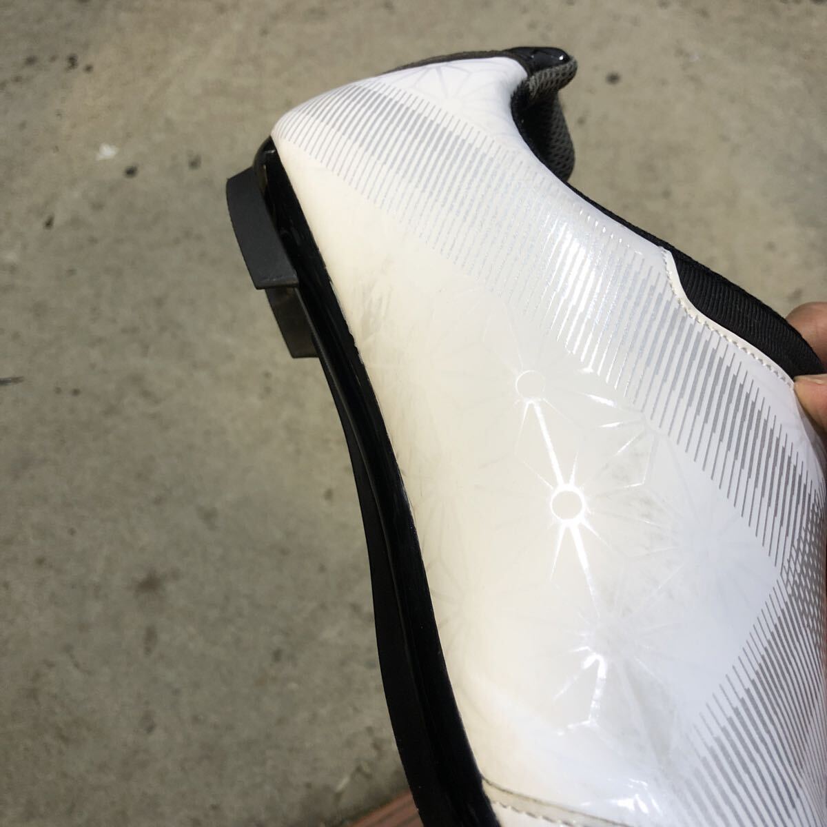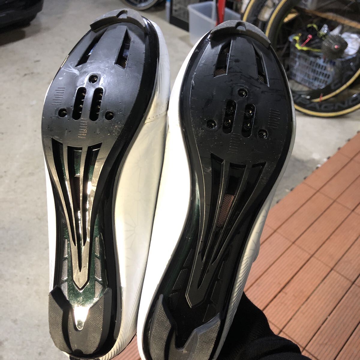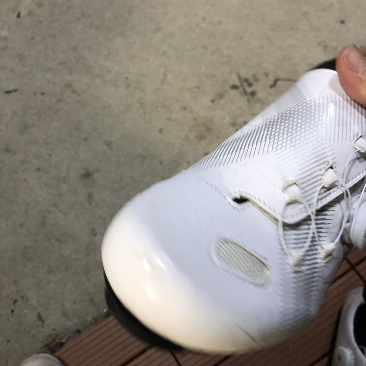 クリートを付けて1回50km走行しただけです。 自身は他のビンディングシューズで27.5cmを履いており、冬場には厚手のソックスを履く為少し大きめのこのシューズを買ってみました。 自身は左27 右27.5cmである為か、やはり左がブカっとしました。