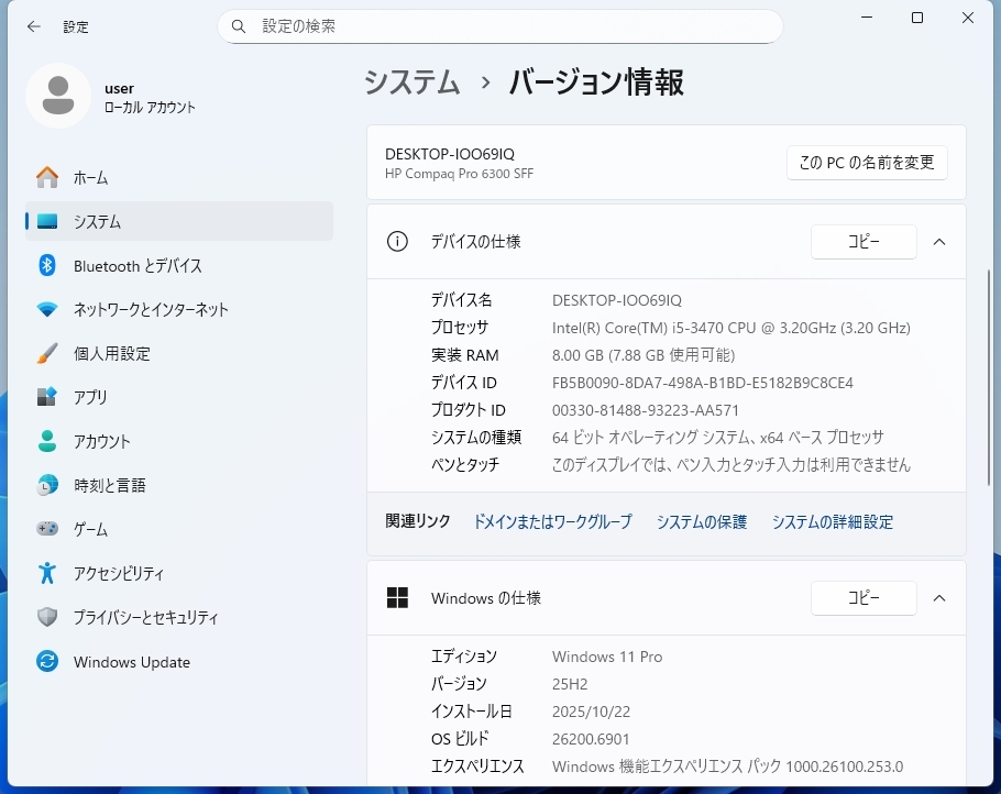 | HP ”Compaq Pro 6300 Small Form Factor” Core i5-3470 3.20GHz・8GB・Windows 11 Professional 64bit (最新ver:25H2) SSD・HDD付き の中古品で、ご入用の方にお譲り致します。 HDD欠品状態で入手の為、別途用意したSSDにWin10をインストール後、Win11(最新ver:25H2)にアップデート・ライセンス認証済み(写真参照)となります。 従って、モニター・マウス・キーボード・電源コード等有れば、落札後直ぐに使用可能な状態となっています。 (稀に、モニターが映らない・キーボードが反応しない・その他等でご連絡を頂く事が有りますが、全ての機器に対応していない事が前提ですので、留意願います) 尚、インターネット接続にあたり、キングソフト セキュリティ Pro(無料版)のウイルスセキュリティソフト(URL:https://www.kingsoft.jp/is/) (有料版に切り替える事も出来ます)と、Microsoftの Office と互換性がある、LibreOffice(フリーソフト)をインストールしていますが、不要な方は、”アプリ”より、アンインストールをして下さい。 確認においては、オンボードのPS/2(マウスはUSB)・LAN・USB2(前・後)・USB3(後)・音声・D-Sub・DisplayPort・PCI-e,PCIスロット・DVD-MULTI(読み込みOK)は、作動する事を確認していますが、接続機器によっては作動しない場合も有る事を、承知願います。 ※中古品ですので、擦り傷(補修あり)等あります。(写真でお伝え出来なくて、申し訳有りません) ※SSDの搭載と8GBメモリにより、i5(第3世代)のcpuでも快適な動作です。 ※CrystalDiskinfoにて正常判定の3.5インチHDD(250GB:フォーマット済み)1台を付属しており、データ保存等に使用されればと思います。 ※現状からの変更=OSの初期化・再インストール・カスタマイズ(追加・取り外し・移動・交換・BIOS設定)・過度な負荷等は、自己責任です。 ※Windowsのインストールディスクは付属しません。 ※パソコンのログインパスワードを設定していませんので、必要な方は設定して下さい。 ※お渡し出来るのは、写真内容(PC本体)のみで、記載内容に間違いがあっても写真内容を優先とし、補填の追加は致しません。 ※以下参考内容 CPUタイプ: Core i5-3470 (4コア・4スレッド) CPU速度: 3.20 GHz (ターボ: 3.60 GHz) RAM容量: 4GB×2=8GB (デュアル作動) SSD容量: 128 GB(2.5インチ) HDD容量: 250 GB(3.5インチ) DVD-MULTI(RW) ゴム足: 横置き×4 電源: AC 100V・50/60Hz(電源コード無し) OS:Windows 11 Professional 64bit =ライセンス認証済み インストールソフト(フリーソフト) ①.キングソフト セキュリティ Pro(有料に変更可) ②.LibreOffice(Microsoft Office と互換性) 仕様:- 参考:https://www.hitachi.co.jp/Prod/comp/OSD/pc/businesspc/product/catalog/sp_pdf/sp_6300sf_131118.pdf Win11:https://www.microsoft.com/ja-jp/software-download/windows11?msockid=1b2e50e123f26f8c11f046d022086e39 Win10:https://www.microsoft.com/ja-jp/software-download/windows10 古物商許可証「和歌山県公安委員会」第651030000841 |