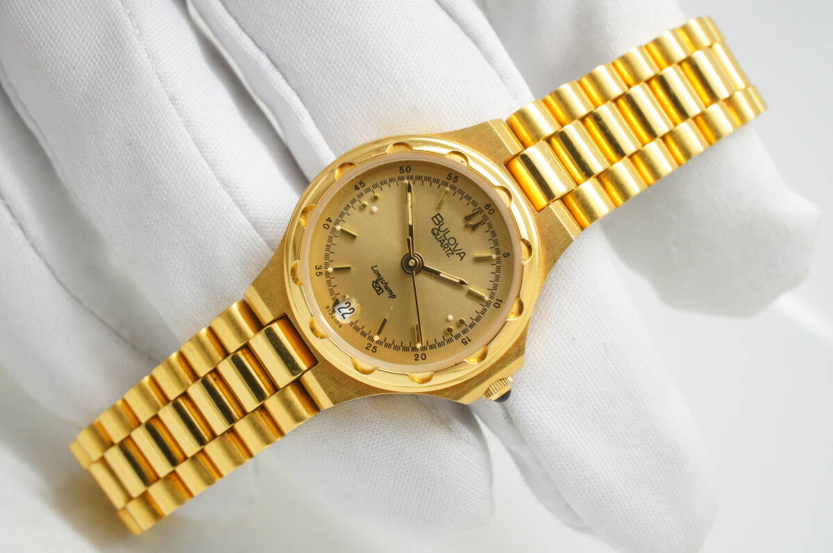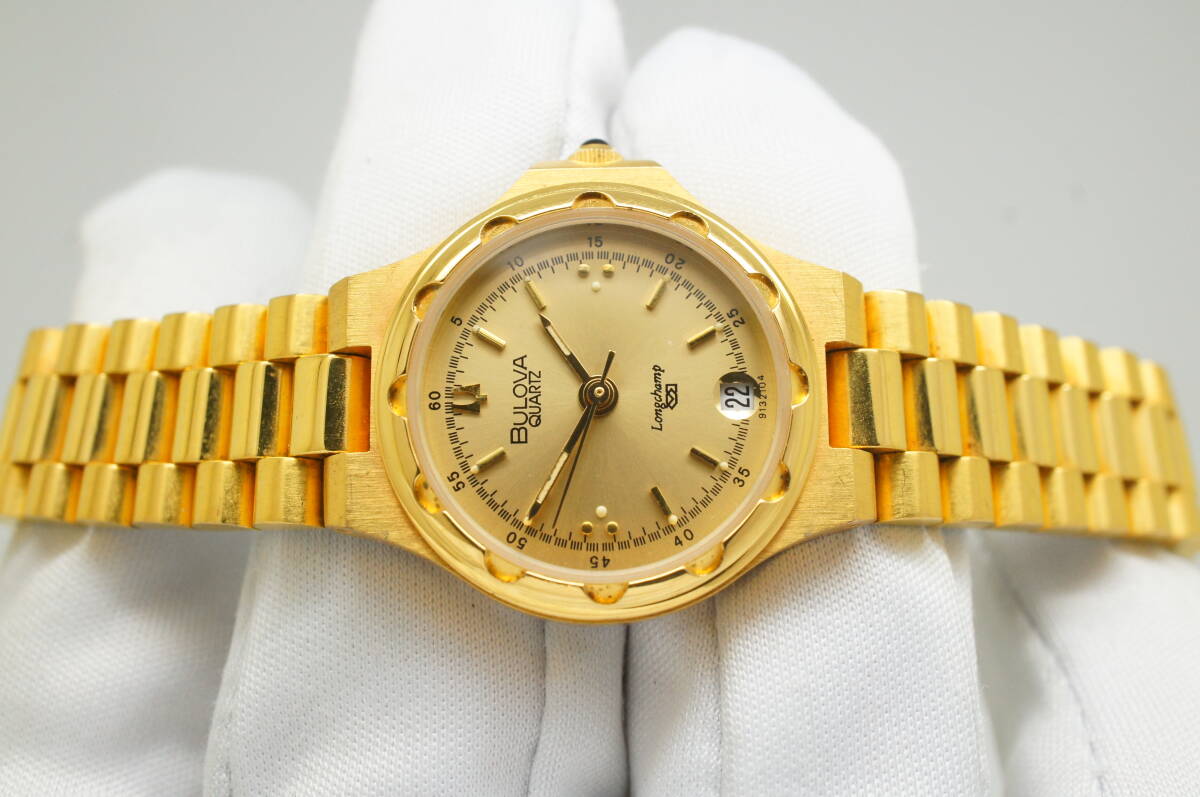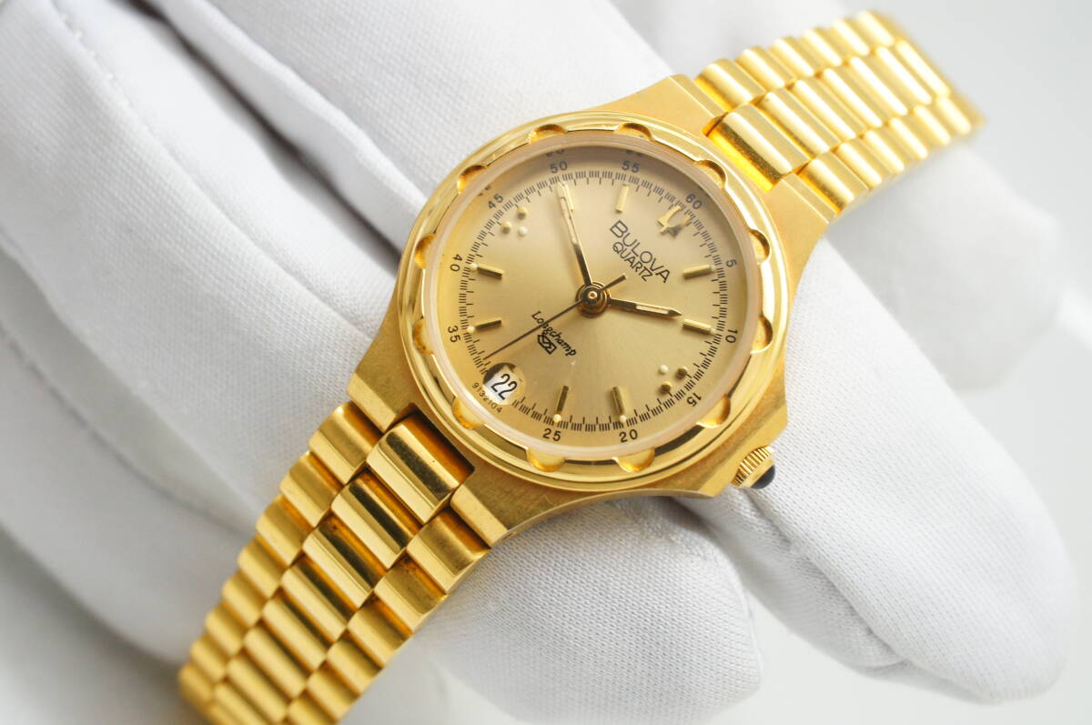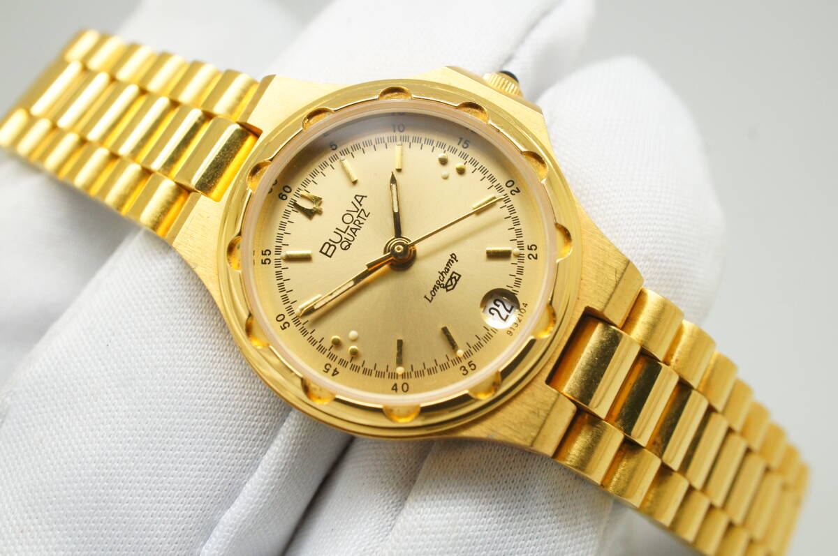 J172●作動良好 BULOVA ブローバ Longchamp 金文字盤 ラウンドケース型 デイト レディース腕時計 ゴールド金 お洒落 クォーツ