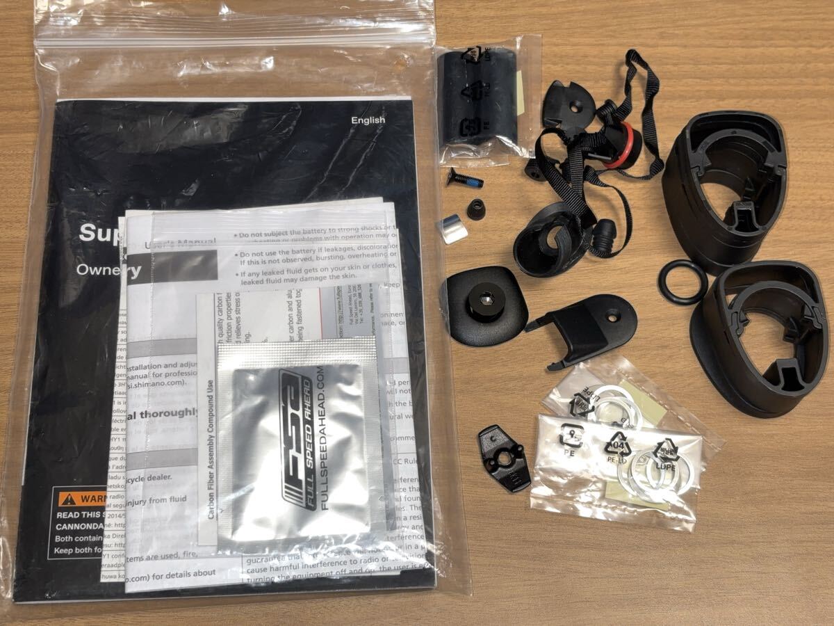 グロメット類は機械式、電動どちらも付属し、完成車付属品としてはハンドル関連、ステム、ホイール類以外は揃っていると思いますが、写真掲載のもので全てになりますのでご確認ください。
