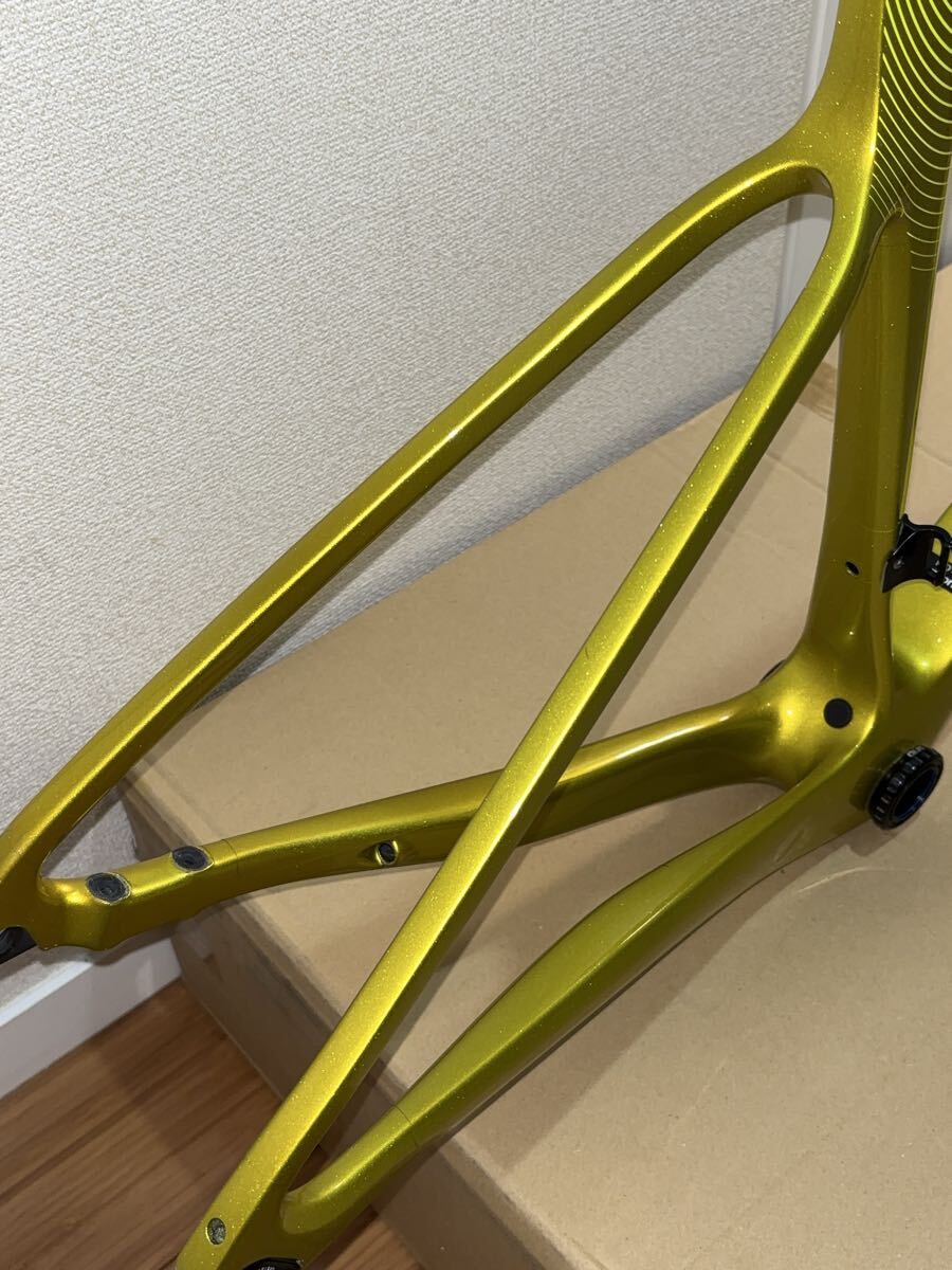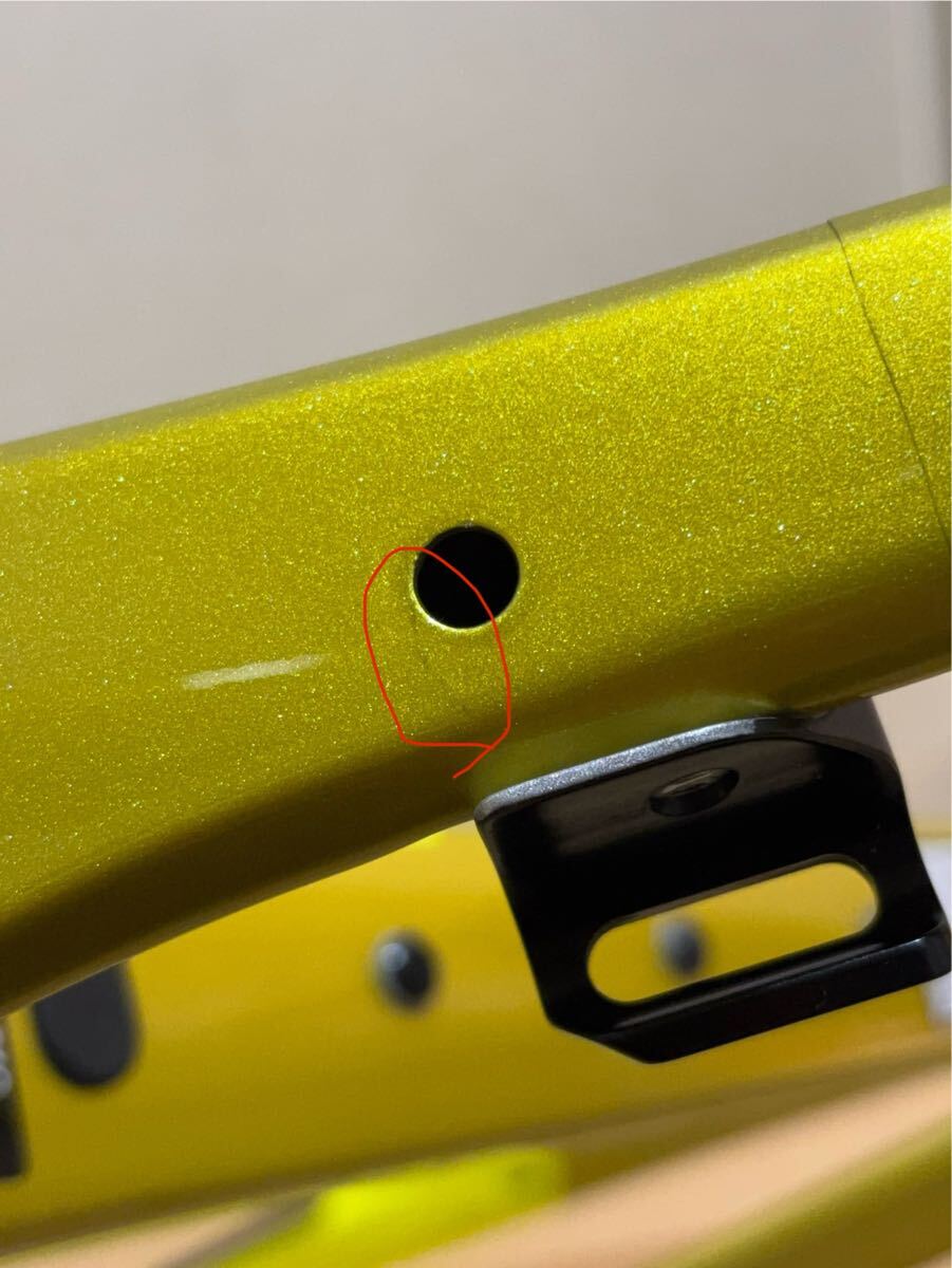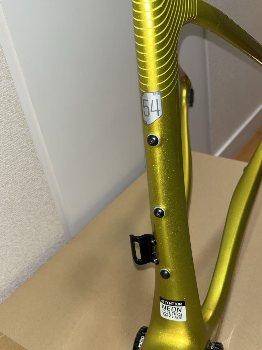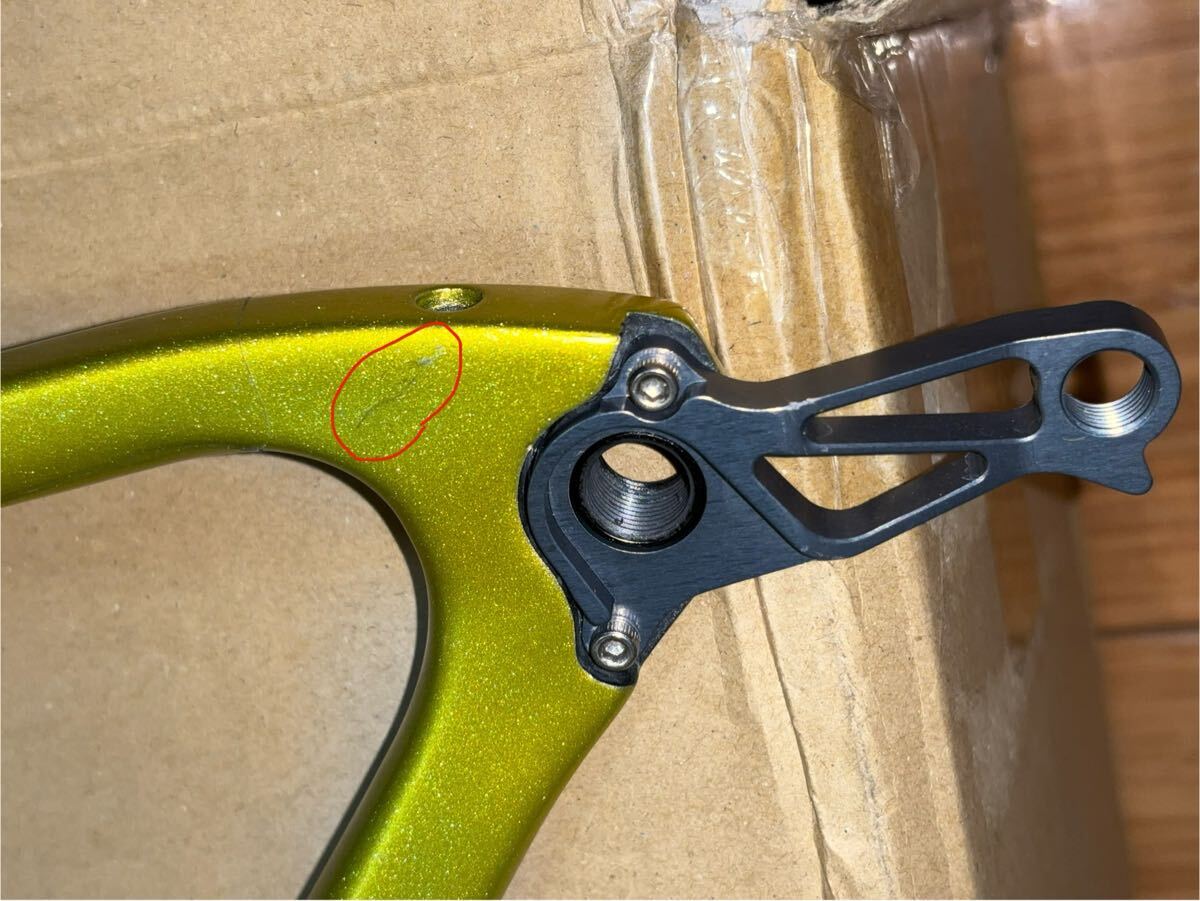 走行2000km未満、見えるような傷は6.7枚目、FDのケーブル穴を外す際に引っ掻いてしまったものと、ディレイラーハンガー付近程度です。いずれも普段見えない箇所の塗装面のみで、クリアで補修してあります。
