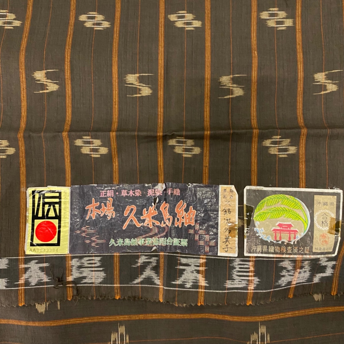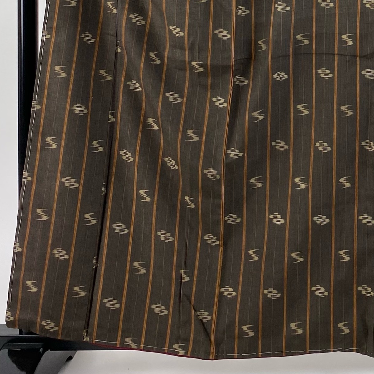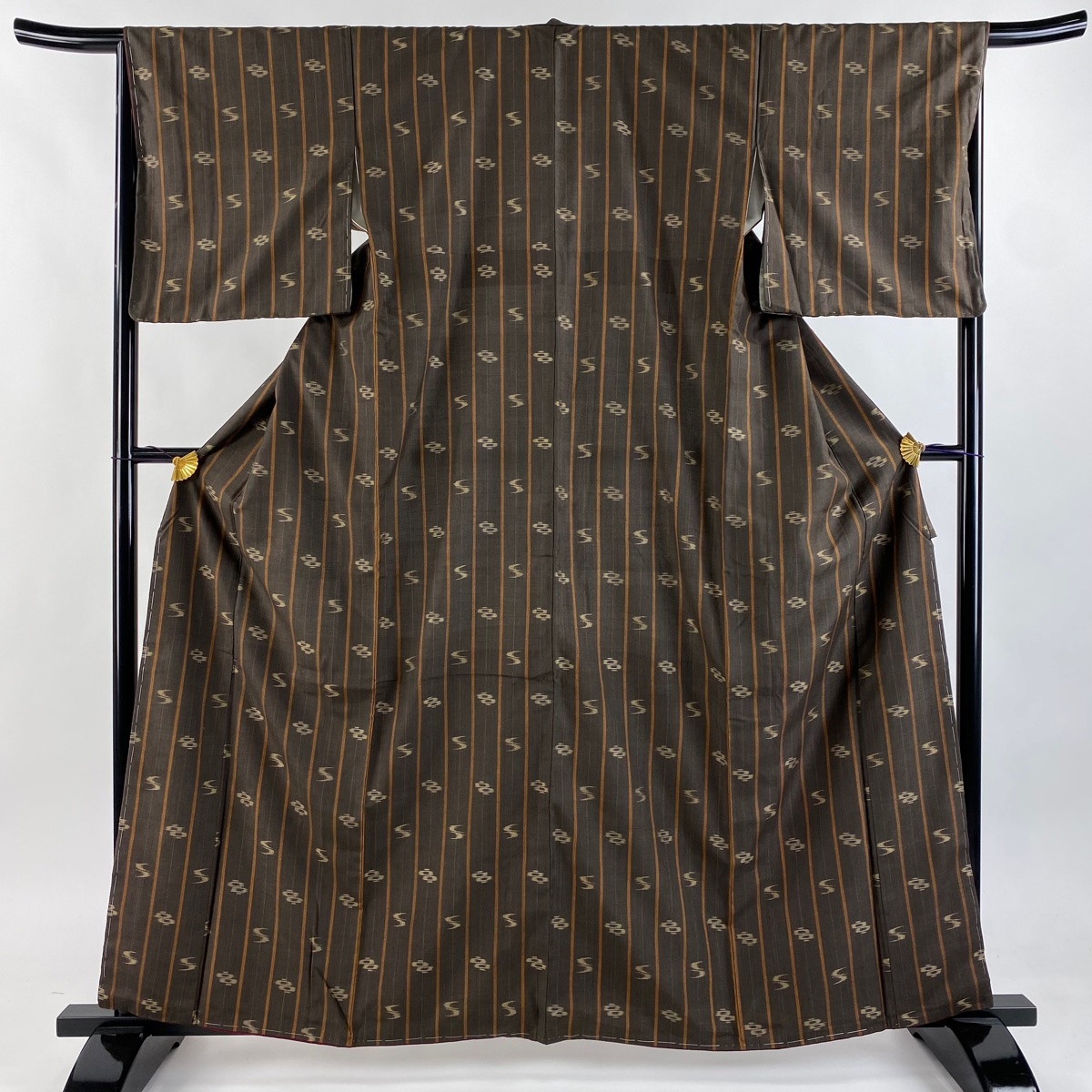 | 紬 美品 逸品 証紙 久米島紬 草木染 泥染 縞 流水 焦茶色 袷 身丈162 裄丈66.5 M 正絹 【中古】 |