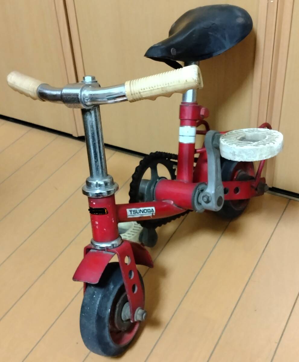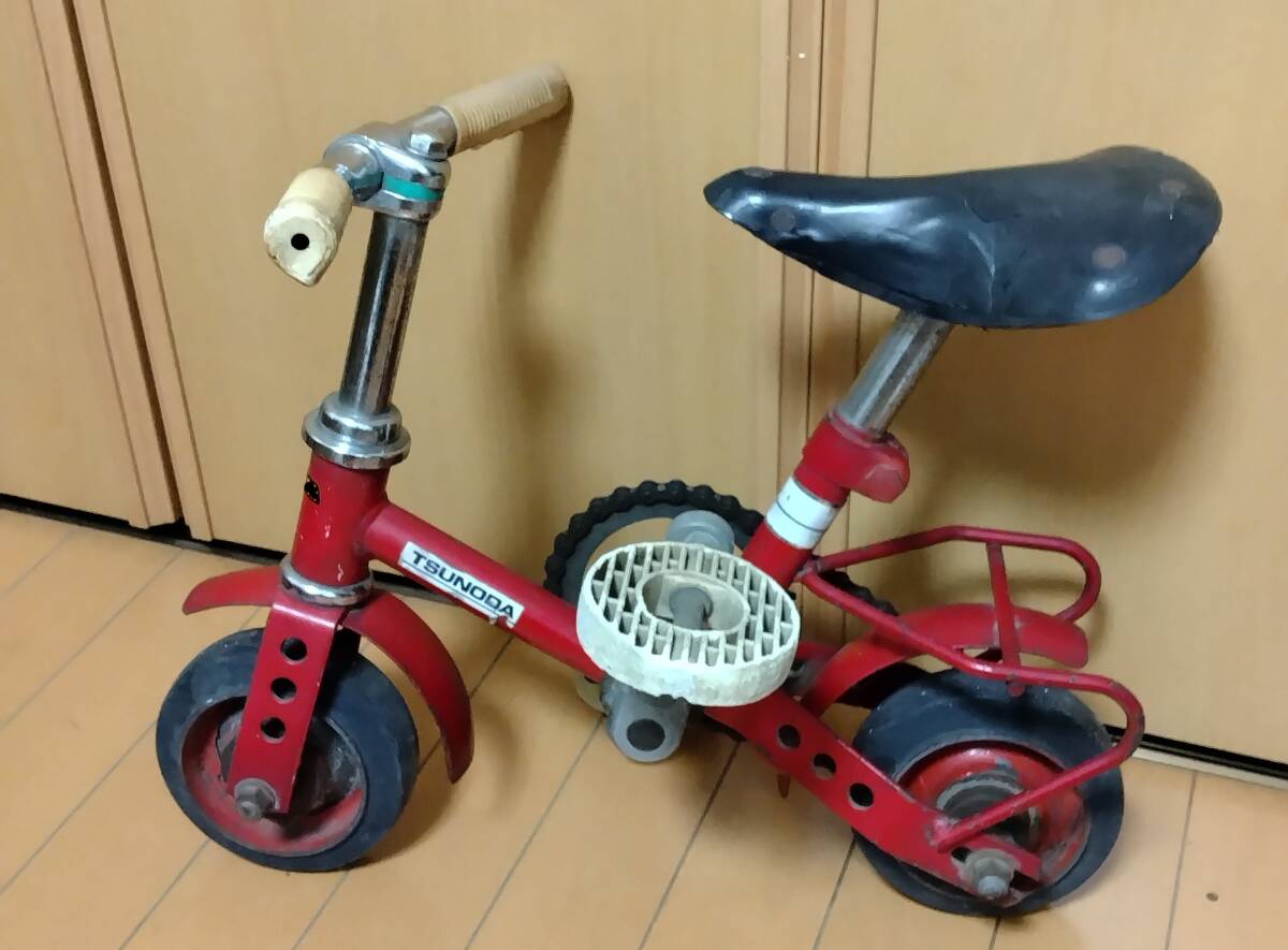 写真にある物が全ての現状品です。空気タイヤではなく全部ゴムのエアレスタイヤ。1970~80年代の製品で汚れや傷、色あせ等があります(赤い塗装がはげている部分があります。プラスチック製のペダルやサドルが劣化しています)。