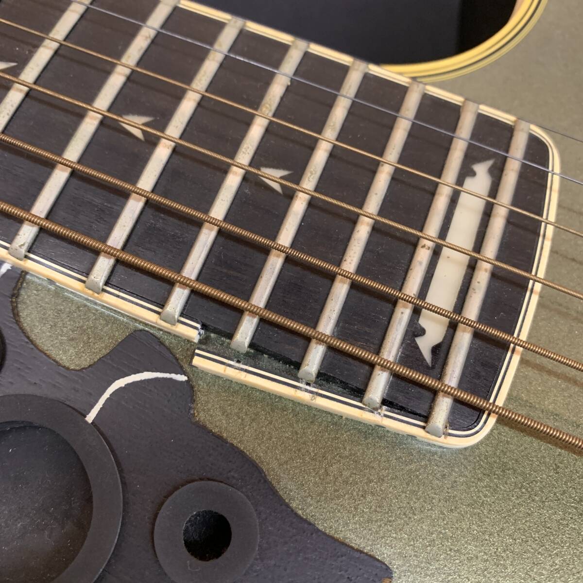 ボディはTopが波打つように大きく膨らんでいる為に弦高がかなり高く、サイドバインディングもクラックから剥がれてきてしまっております。