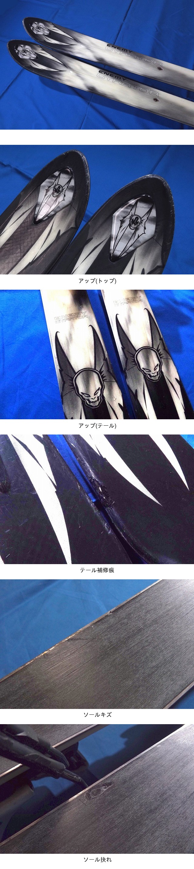 | ★ | 商品状態 | トップシートのテール近くに一ヶ所補修痕が有るほか、それなりに多少のエッジキズが見られます。 シートには写真の通りビン下に一ヶ所補修の必要は無いまでも小さなケズレがあり、石踏の様な薄い線傷が数か所ありますが、目立つ極端な削れや心材が出るほどのダメージなどは無く、モーグル機としては比較的良好な状態だと思います。 一応、毎年使用後には軽くメンテしてから保管してましたが数年使ってなかったため、出品に際して軽くエッジの角出しやワクシングなど、マシンチューン相当の仕上げはしてありますので、好みに合わせて前後エッジを軽くダリングするだけで、直ぐにお使いいただけます。 その他、気が付かない汚れや細かなキズ、ビンディングのキズや塗料の剥がれなどありますが、ご理解をお願いします。 |