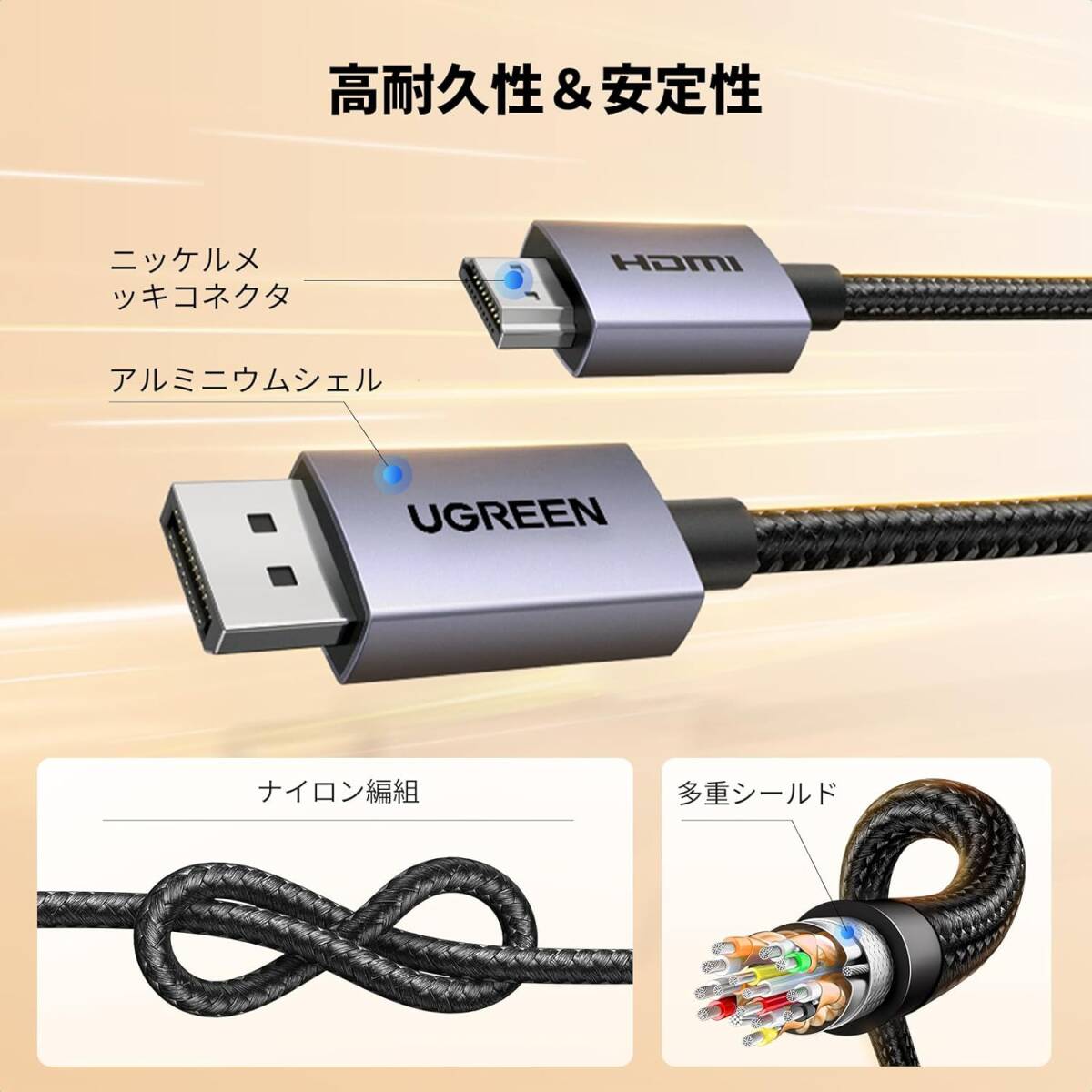 • 【優れた素材】UGREEN ディスプレイポート HDMI 変換ケーブルは、4 層のシールドと太い銅線を備え、電磁干渉 (EMI) とクロストークを低減して安定した信号伝送を実現します。長寿命を実現する先進的な素材で作られています。アルミ合金ジャケットは錆びにくく、放熱を加速します。丈夫なナイロン編みジャケットは 10,000 回以上の曲げに耐え、従来のPVC より 10 倍耐久性があります。