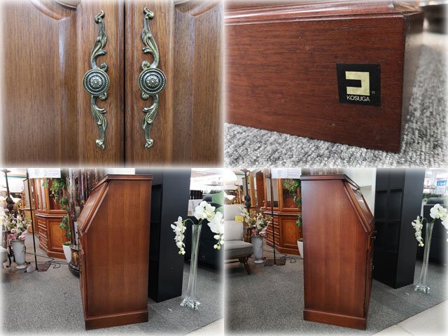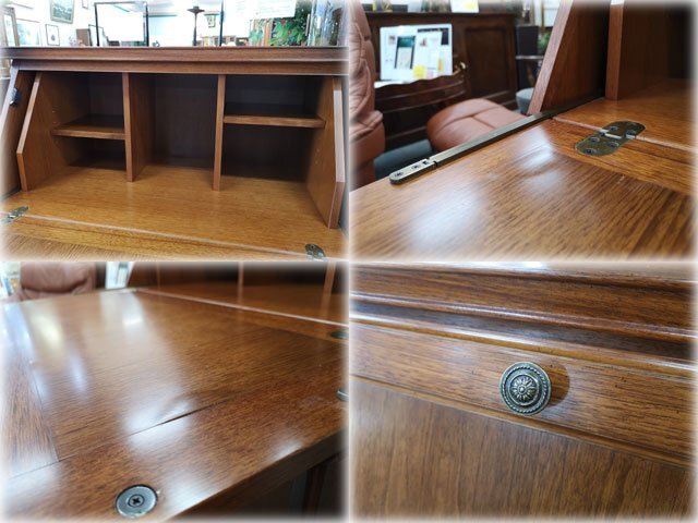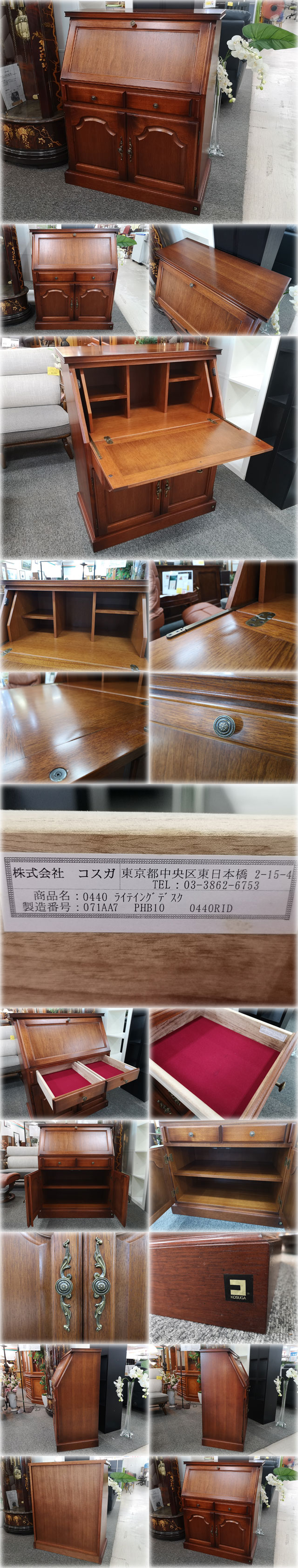 コスガ ライティングビューロー ニューイングランド リージェントハウス 0440ライティングデスク を出品いたします。 ■特徴■ 日々、エレガントに生きる。 時に磨き抜かれた伝統のスタイルを尊びながら、 豊かな感性と、洗練されたテイストで、 個性を演出する。 そんな「トラディショナル」の本質を知る人々に贈る コスガの自信作です。 最高級のウォールナット材を用い 伝統的な手法で丹念に仕上げました。 都会にも、緑豊かな郊外にも似合う エレガンス漂う明るいアンティーク仕上げです。 外装に目立った大きな傷みは見られませんが、 デスク展開時の内側(天板部)に 一部浮き・膨らみが見られます。 写真で状態をご確認ください。 写真に写っている周りのものは付属しません。 発送はアート家財おまかせ便でお送りします。 現在コスガでは廃盤となっており大変稀少です。 販売当時の定価は168,000円の非常に高価な商品です。 格安出品いたしますのでこの機会をお見逃しなく! |