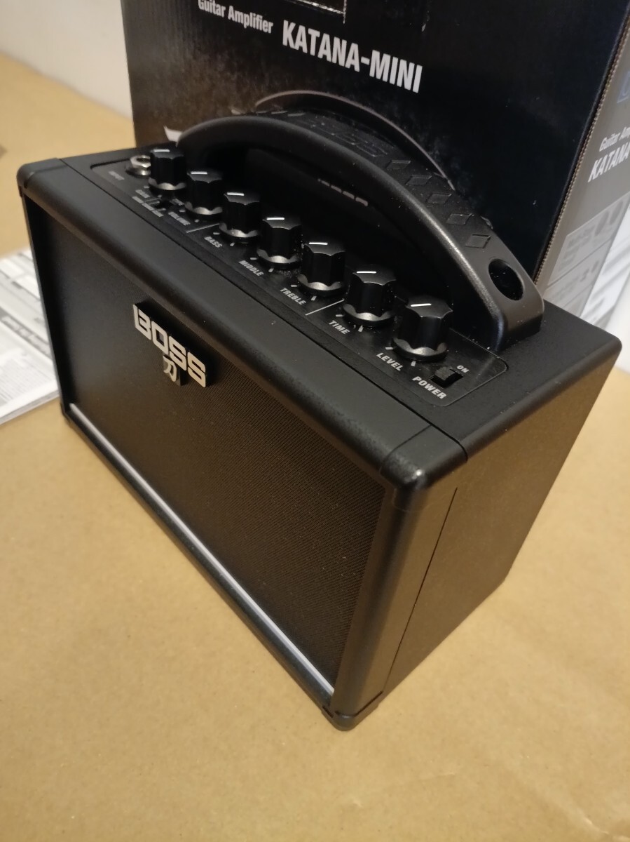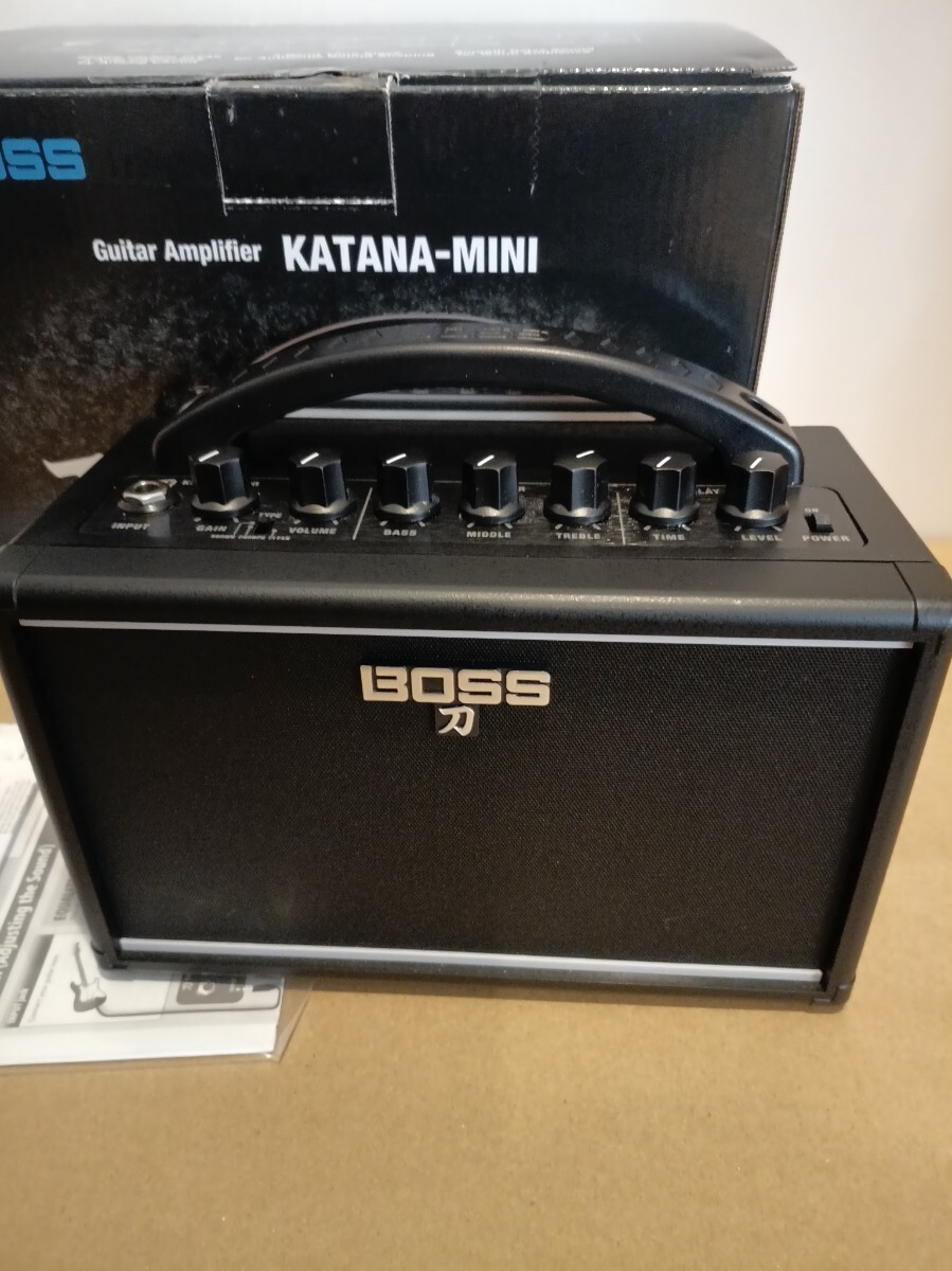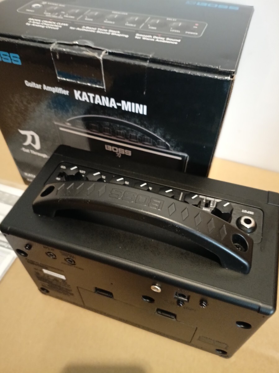 BOSS KATANA - MINI  ギターアンプ です。大手楽器店より新品購入した物ですが、試し弾き程度で、殆ど使用せずに保管していたので、本体の状態はとても良好、美品かと思います。新品購入を検討されている方にも、オススメかと思います。動作確認済み出品物は画像の物が全てです(*電池は付属しません。各自ご用意ください)。仕様等に関しては、メーカーサイトにて各自ご確認ください。画像をよくご確認頂き、納得された方のみご入札ください。Used扱い品になりますので、完璧な新品状態を求める方、コンディションを神経質に気にされる方は、絶対に入札しないで下さい。トラブル履歴、評価の悪い方は、こちらの判断で入札を制限する場合がございます。仕様、音質等の思い違いでの返品、返金は致しません。ノークレーム、ノーリターンをお約束願います。