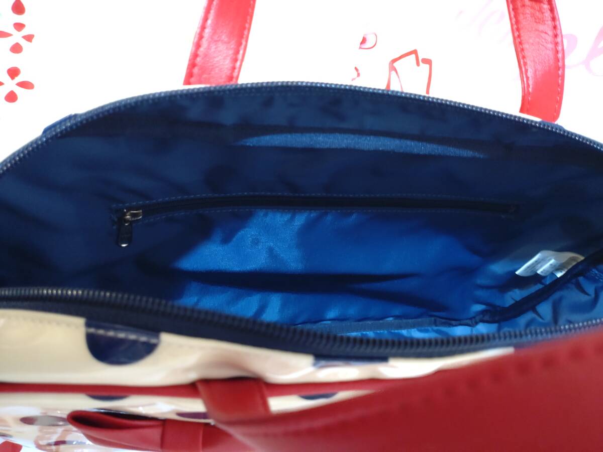 内側は片側にポケット2つ、もう片側にはファスナー付ポケットがあります。ショルダーベルト付きです。