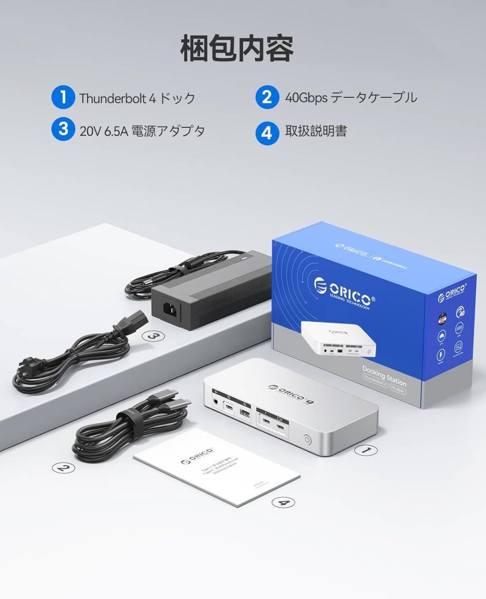 • 【パッケージ内容】ORICO TB4 Thunderbolt 4 ドッキングステーション、1*130W 電源アダプタ、 1M 40Gbps USB-C - USB-C ケーブル、電源ケーブル、取扱説明書。この USB C ドッキングステーションはプラグアンドプレイでドライバは不要です