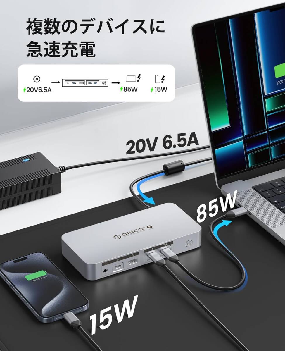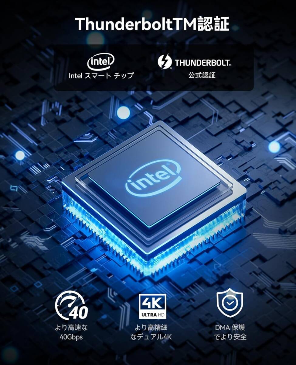• 【高速充電と転送】Thunderbolt 4ホストポートから85Wの充電でUSB-Cラップトップを電源供給し、モバイルデバイスをダウンストリームThunderbolt 4ポートに接続してPD 15W充電を行うこともできます。また、最大40Gbpsの超高速データ転送もサポートしており、3GBのファイルを1秒で転送できます。
