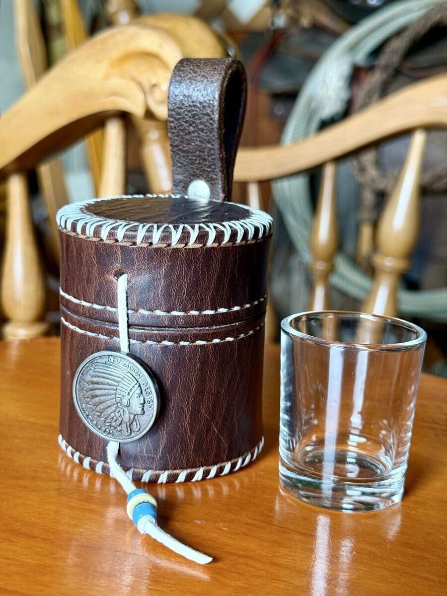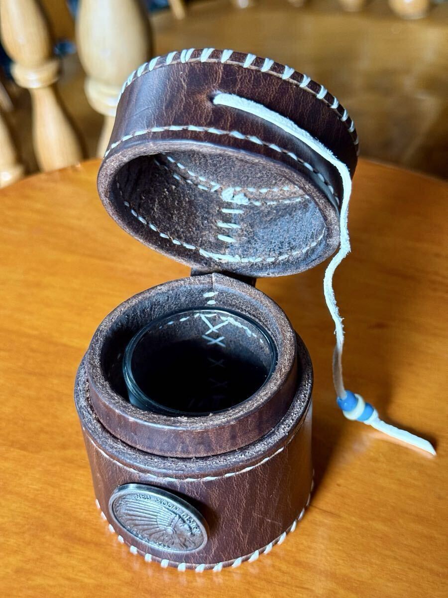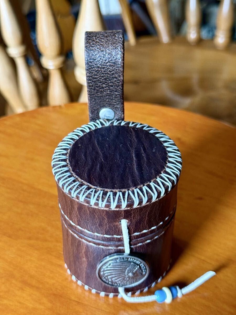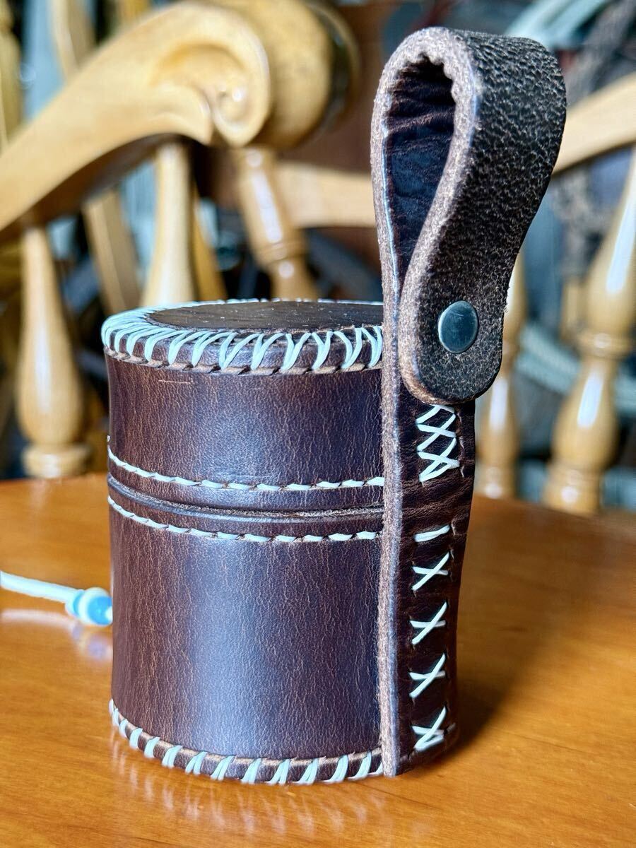 厚さ3.5mm前後の厚手の革を用いて制作しております。店舗のディスプレイやアウトドアなどに如何でしょう。