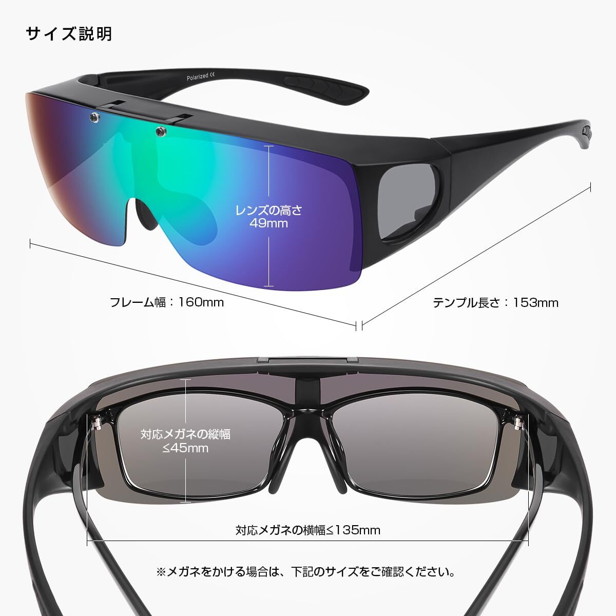 普通のサングラスとは違い、メガネを掛けたまま装着できる特殊なサングラス!使用可能なメガネサイズは約135x45mmです。