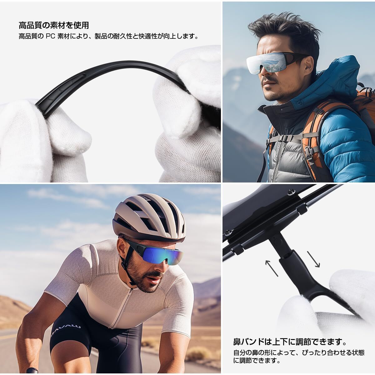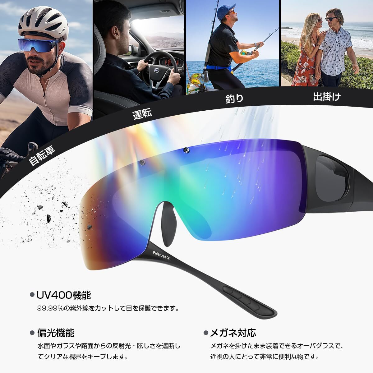 サイクリング、釣り、ランニング、野球 紫外線カット UV400 跳ね上げ式 格好いいサングラス メガネをかけたまま対応のサングラス