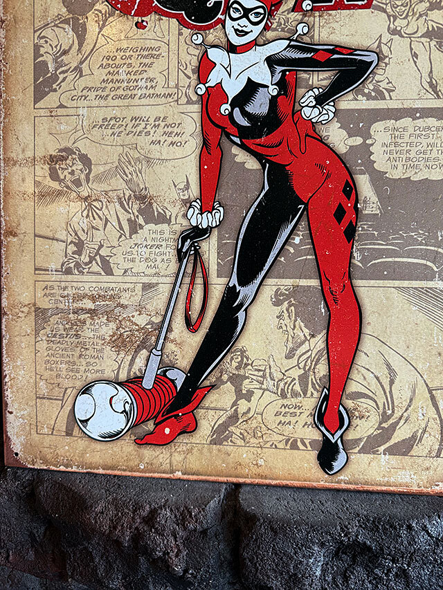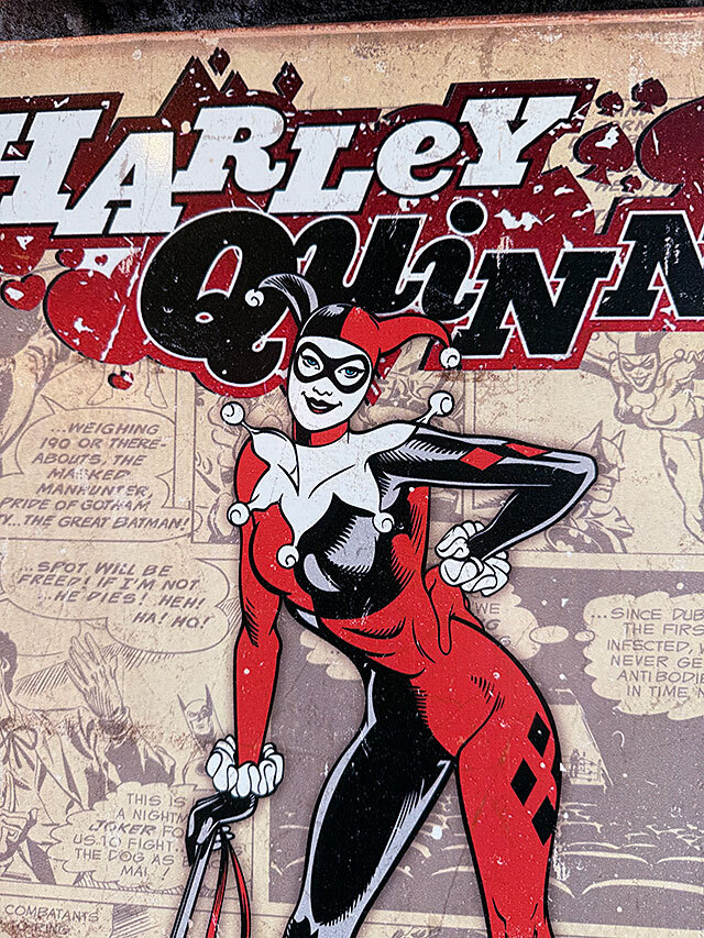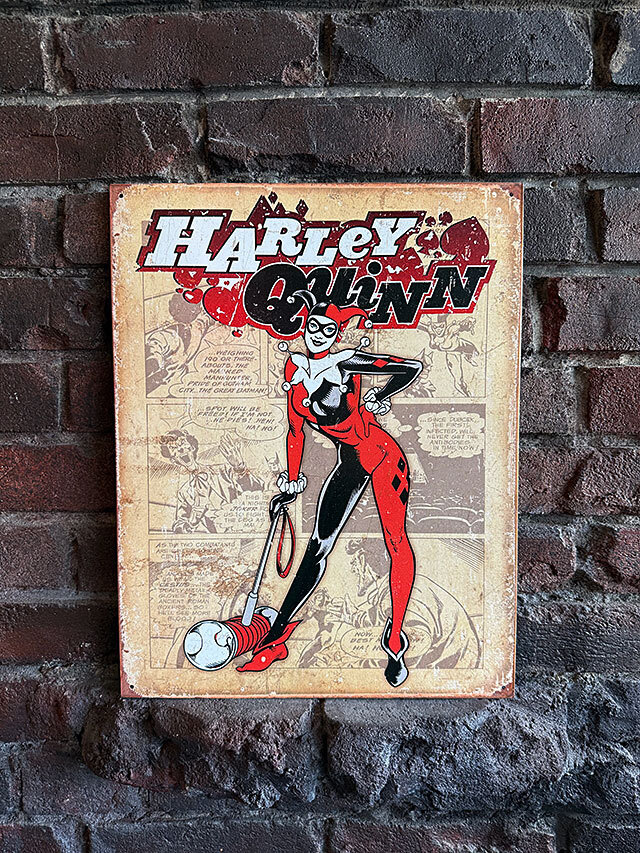 バットマンに登場する敵役、ハーレークインの昔のコミック時代のアートを復刻させたブリキ看板です。