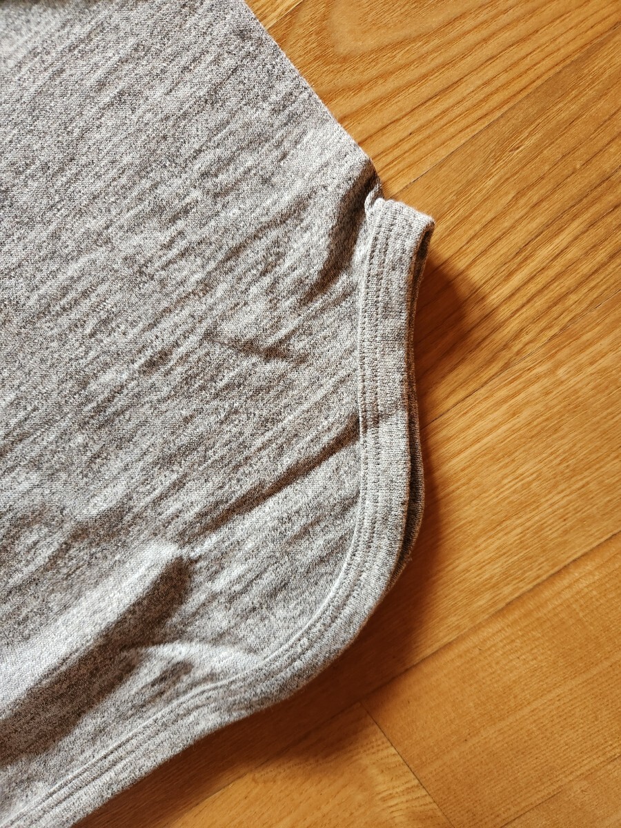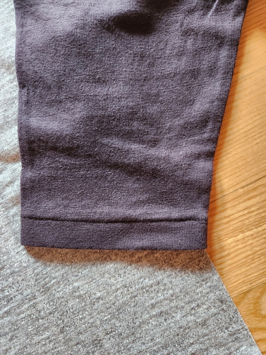 12番のムラ糸で独特の陰影が出るように編まれたこの生地はシャドウボーダーと呼ばれており、無地でありながらうっすらと横段のようなムラが浮かびます。