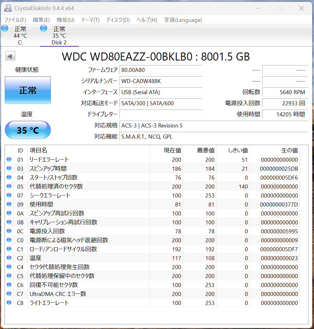 通電時間等は画像でご確認ください。S.M.A.R.T.では、訂正不能エラー等の大きな問題は発生していません。