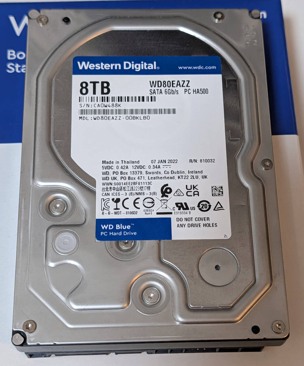 ウエスタンデジタルのWD Blueシリーズの8TBのハードディスクです。インターフェースはSATA6Gb/sです。記録方式は「CMR」です。