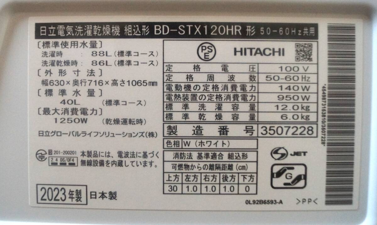 【日立】HITACHI BD-STX120HR-W 2023年製 ドラム式洗濯機 右開き 洗濯・脱水容量12kg/乾燥容量 6kg リコール済 (F6)