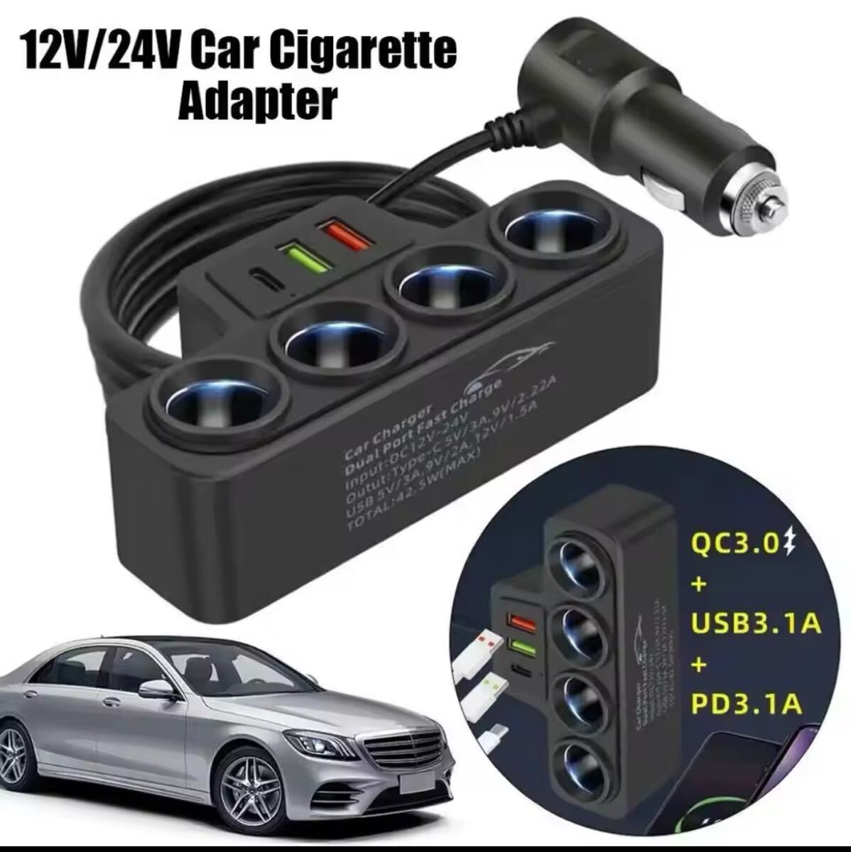 4連シガーソケット、USB 2ポート、タイプC付き車載充電器のご案内です。