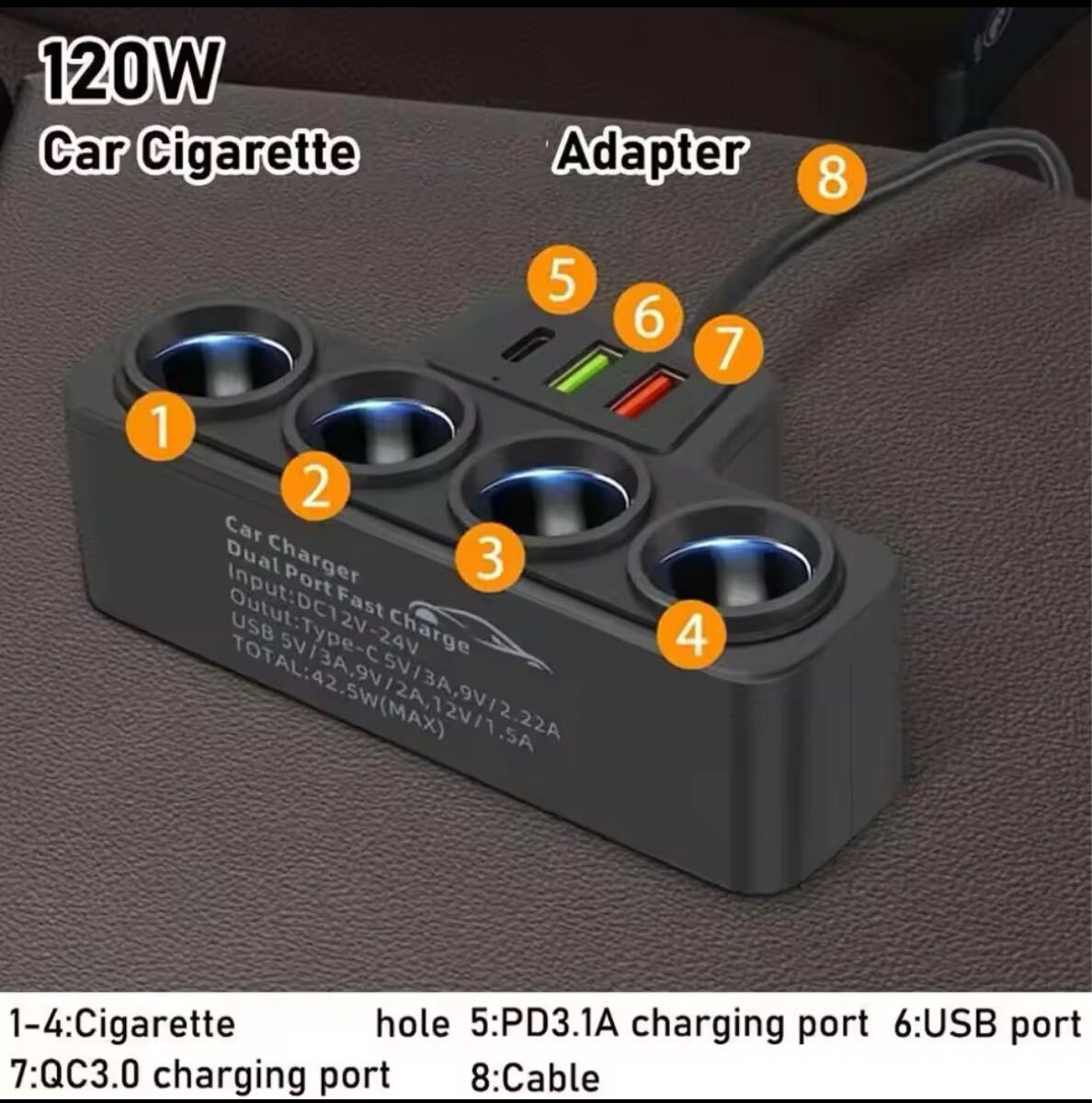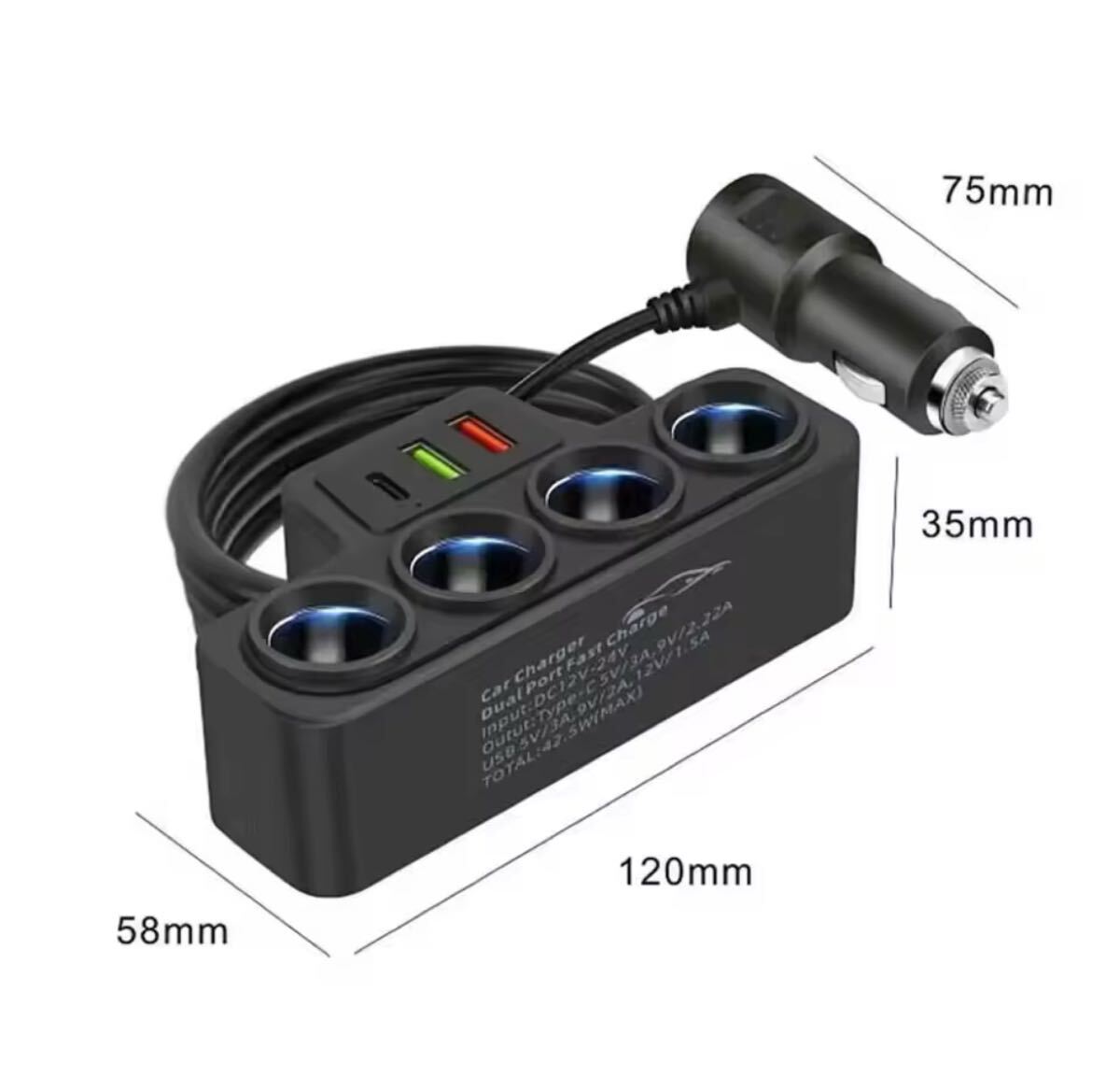 4連シガーソケット、USB 2ポート、タイプC付き車載充電器のご案内です。