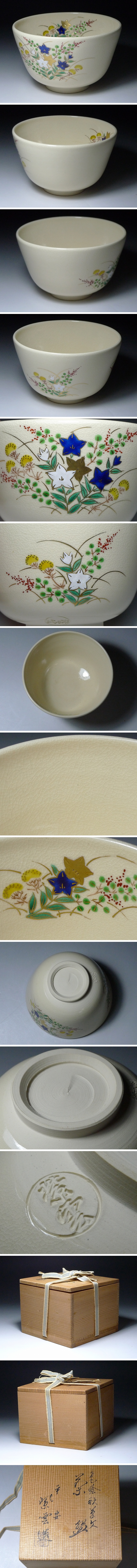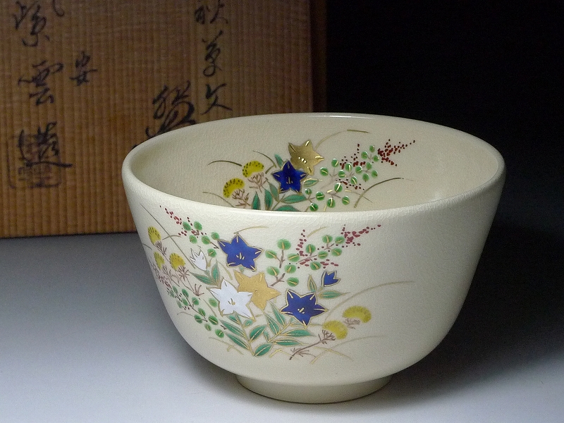 茶道具 京焼 平安 橋本紫雲造 金彩 色絵秋草文茶碗 共箱 抹茶碗 茶器 陶器 陶芸 伝統工芸 茶陶 茶事 抹茶 骨董