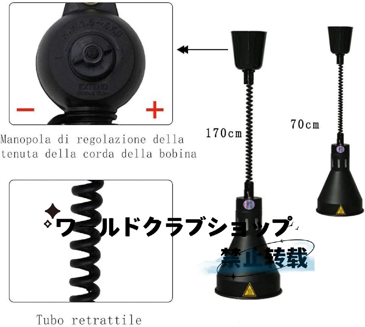 【高さ調節可能なフードヒーターランプ】ランプ全体の高さは60~180cmです。ただし、ランプ自体に重量がありますので、吊り上げる際は限界まで伸ばさないようにしてください。